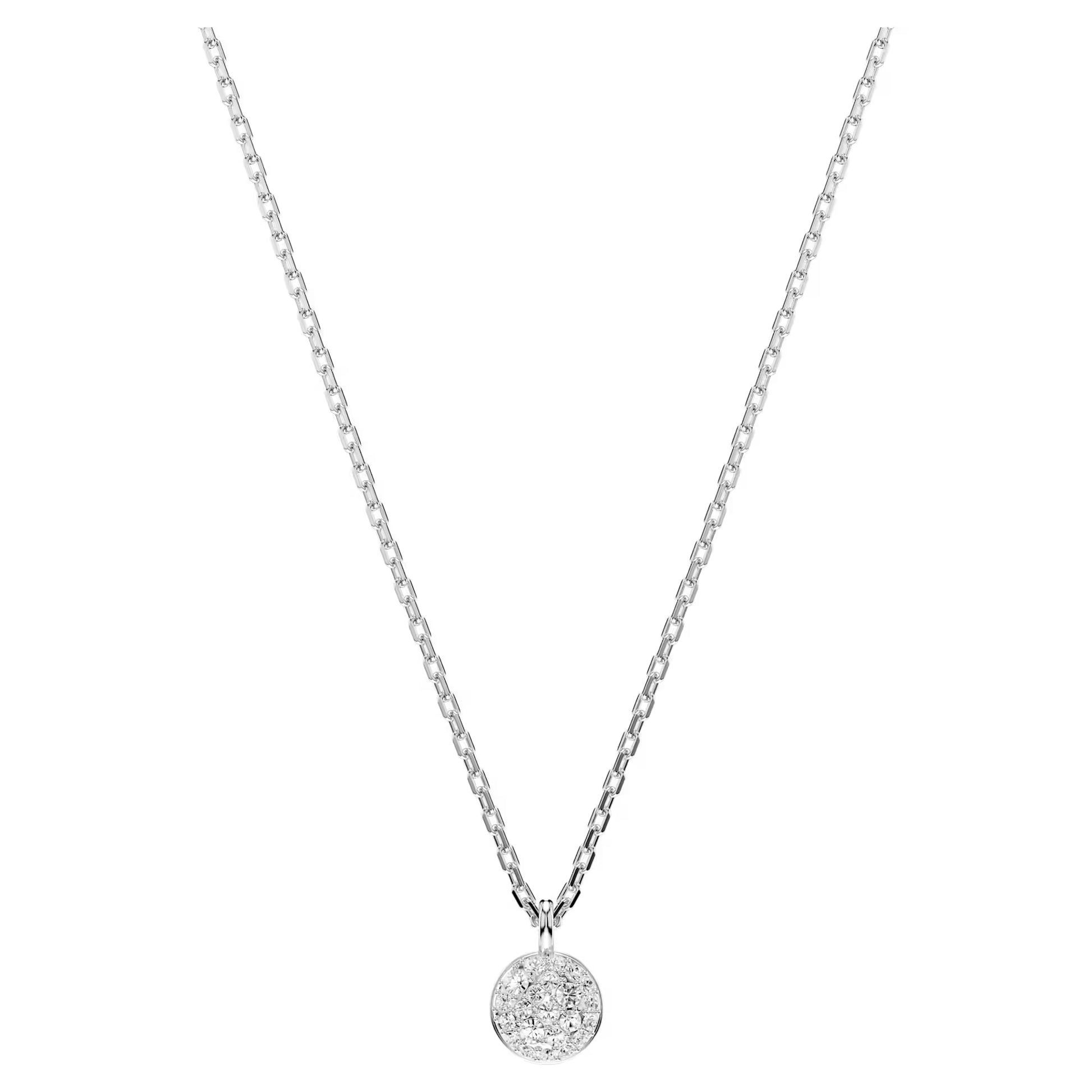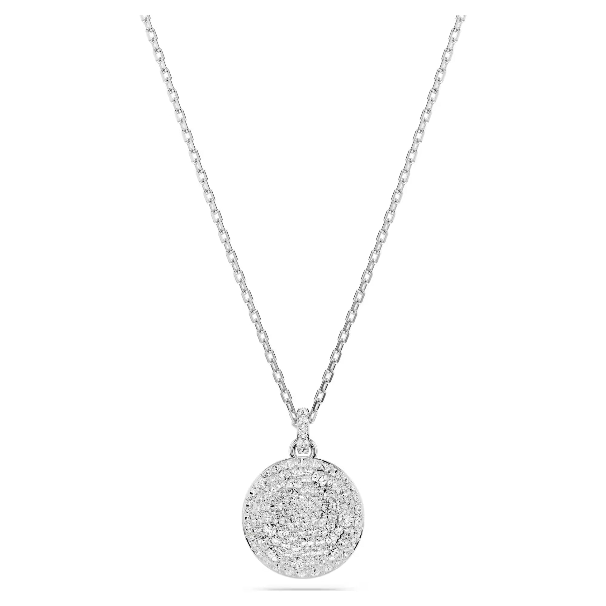 This shimmering layered pendant is the ideal way to fill your style with light. The rhodium-plated design features two chains, each with a domed meteor motif that is beautifully adorned with a snow pavé of clear round crystals in different sizes. For extra versatility, the pendant can be reversed, revealing a halo of crystals around the larger motif, and a single crystal at the center of the smaller motif. A wondrous gift for yourself or a loved one.