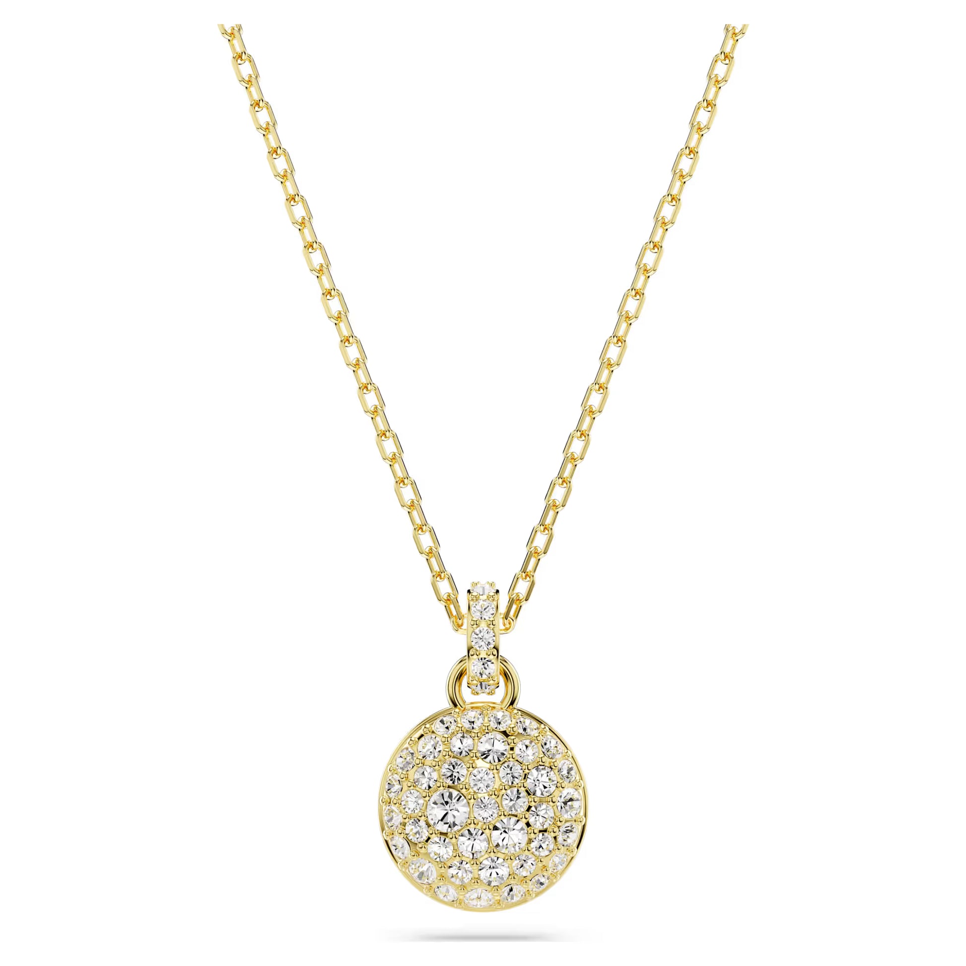 This galaxy-inspired pendant will bring dazzling impact to any style. The gold-tone plated design is worn on a delicate chain with a lobster closure and features a domed meteor motif that is beautifully adorned with a snow pavé of clear round crystals in different sizes. Wear it as a wondrous piece of light-catching joy.