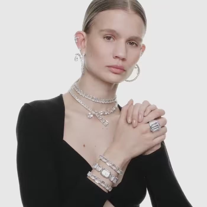 Swarovskis mastery of light is on full display in this radiant Millenia bangle. Around the wrist, the rhodium plated band is octagon shaped and set with a glittering array of clear octagon-cut crystals. Perfect for amplifying the glamour in both day- and night-time looks.