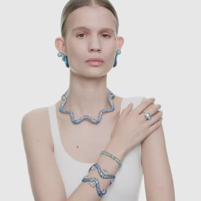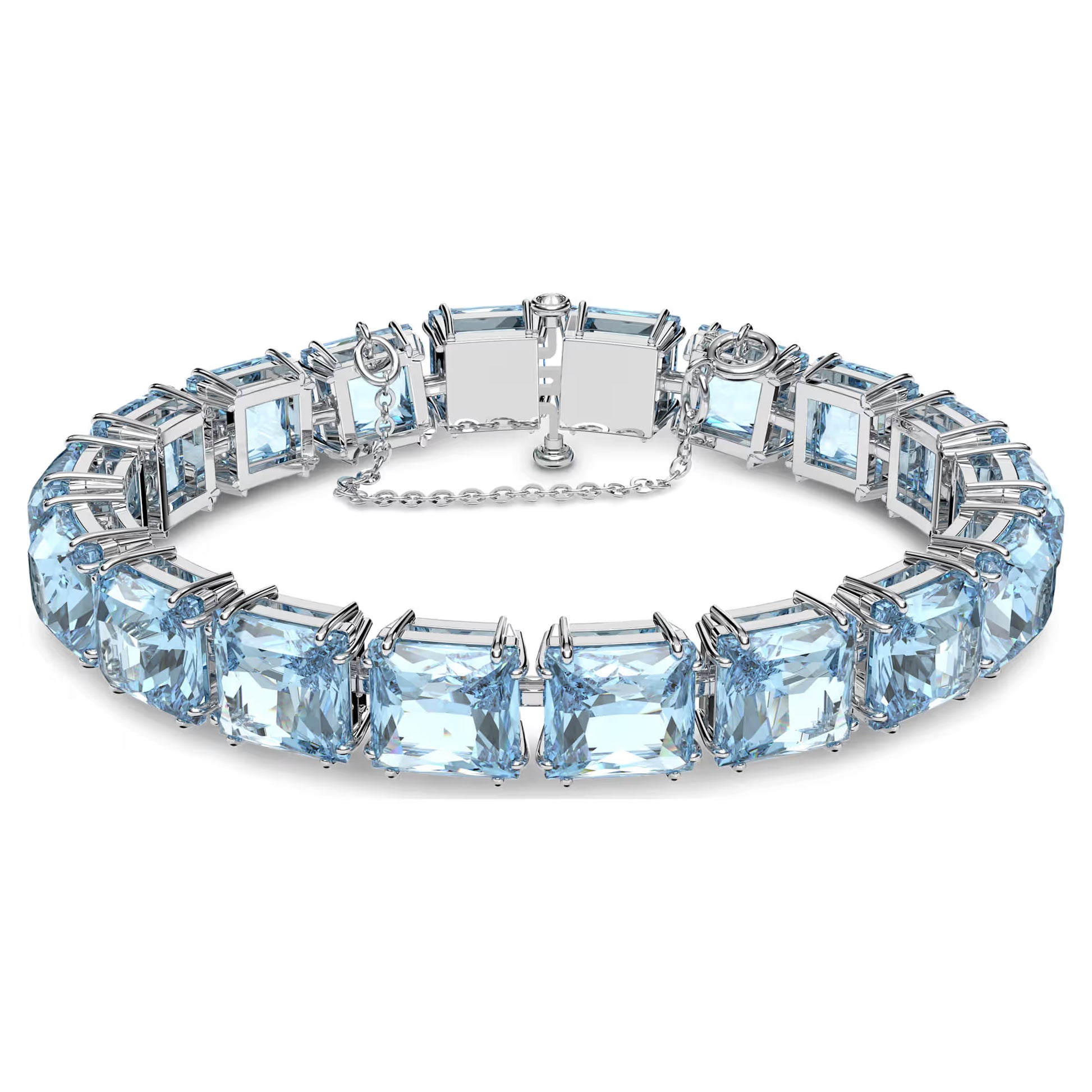 Add a shot of geometric colour to any look with this striking, everyday Tennis bracelet. With a concealed fastening and sleek, rhodium-plated frame, it allows the vibrant, aquamarine, square-cut crystals to steal the spotlight. Wear yours solo over a cuff for a uniquely chic statement, day or night. This Tennis bracelet is part of the Millenia family, designed by Creative Director Giovanna Engelbert for Collection II. How to close and open it: slide the hooks into the corresponding holes at the base of the end stone and push to click into place. Fasten the security chain using the small lever clasp. To open, unfasten the security chain and press the buttons on either side of the stone at the same time to release the hooks.