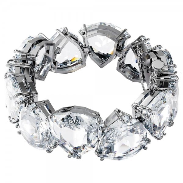Expertly crafted from a row of trilliant cut crystals, this unique bracelet will become your new wardrobe staple. Finished with a hidden closure and sleek rhodium plated setting, you'll want to wear it again and again: whether styled over a cuff for a uni