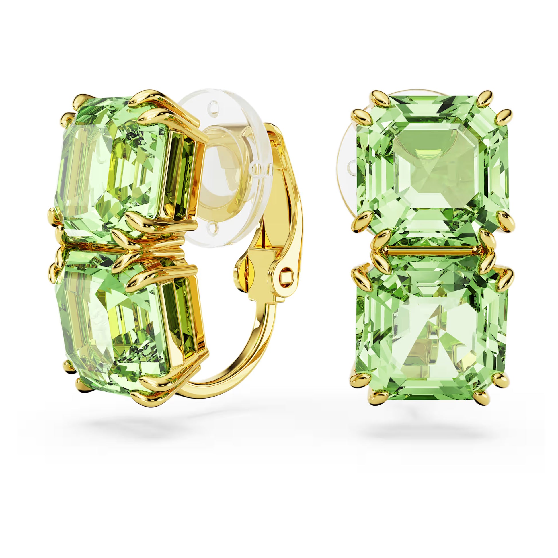 Millenia Clip Earrings, Square Cut, Green, Gold Tone Plated