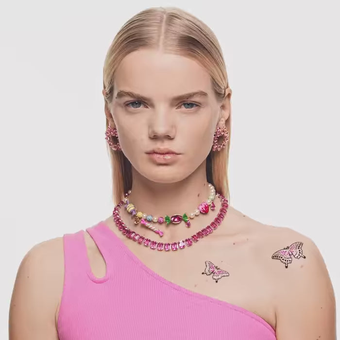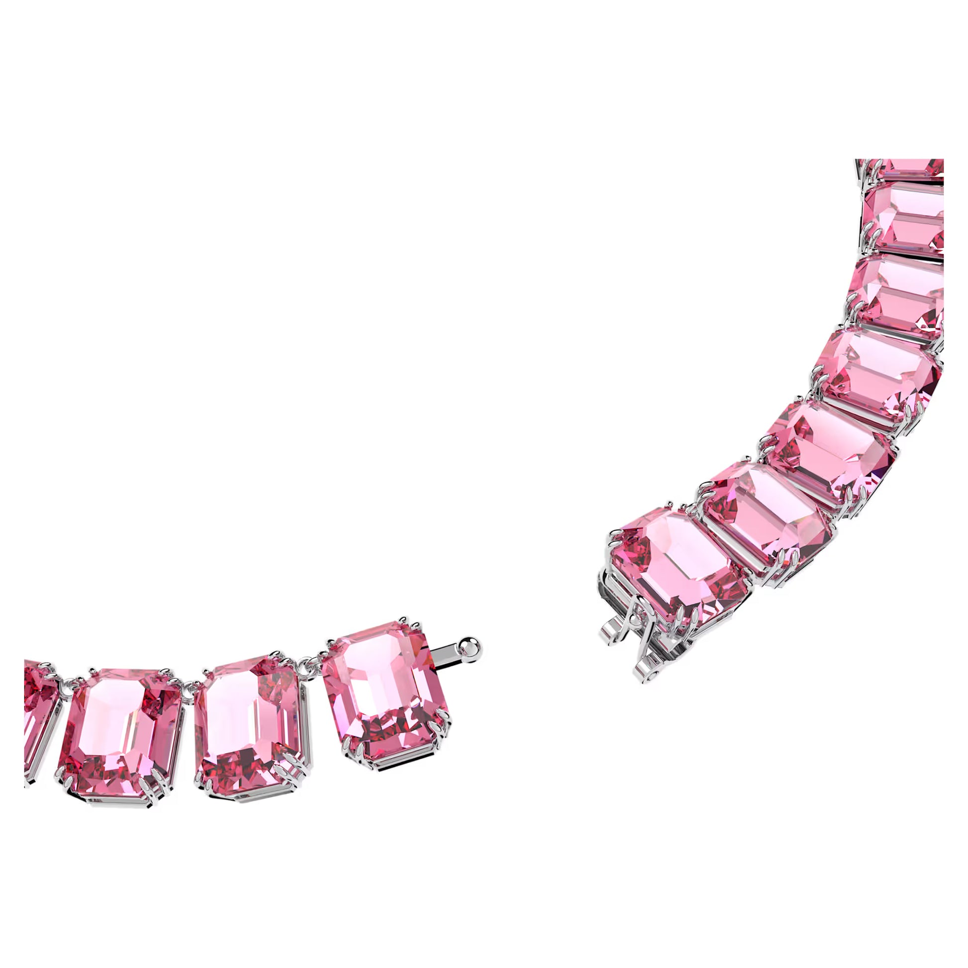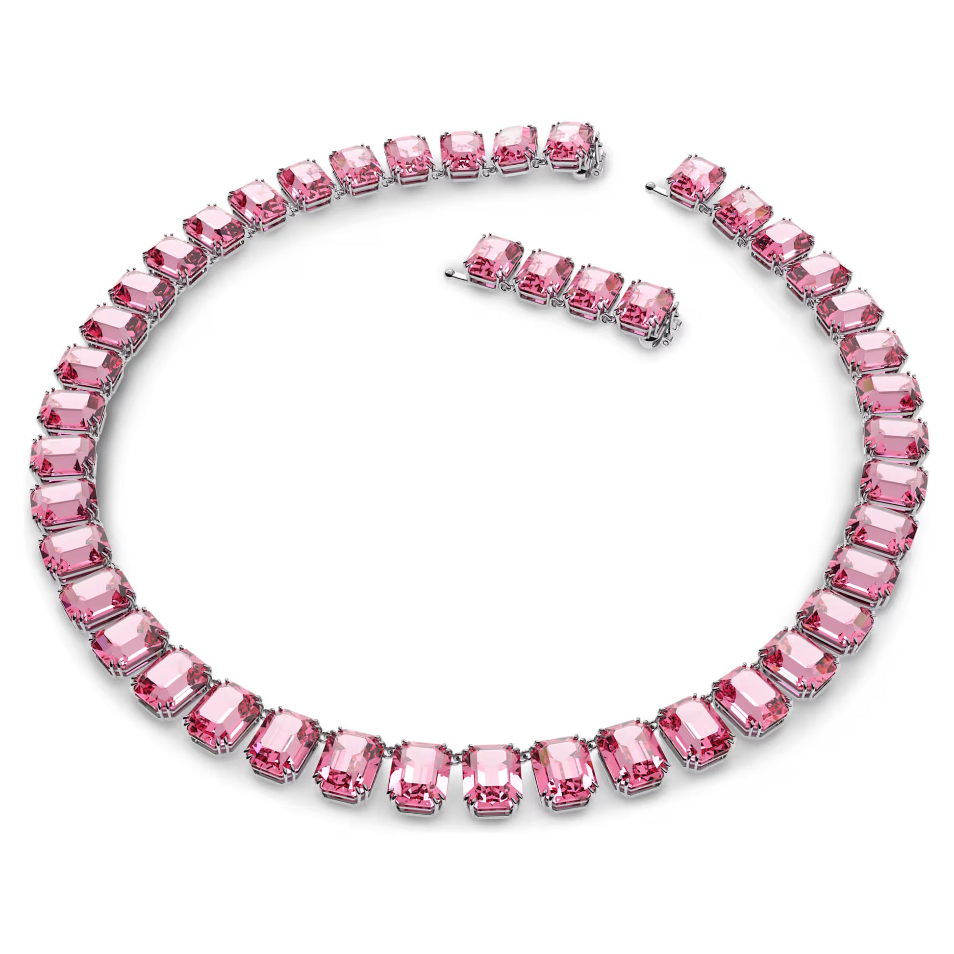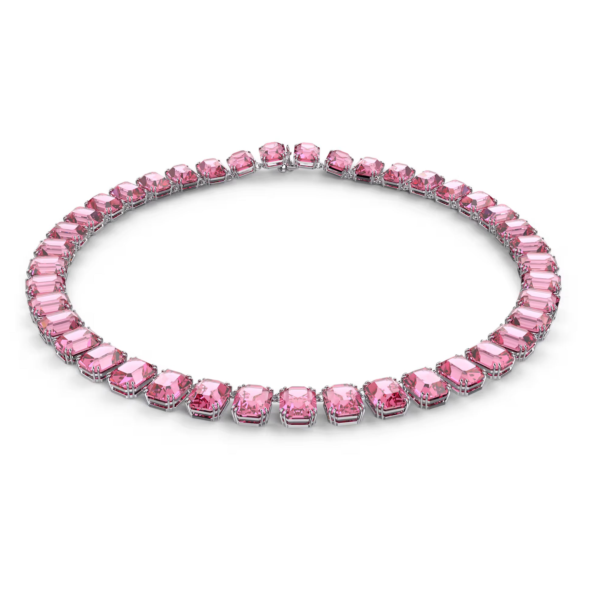 This piece is part of Swarovskis Millenia collection. This collection stands out with its geometric-inspired design. The dazzling necklace features pink octagonal crystals. The metal used for the piece is rhodium-plated. An invisible closure secures the b