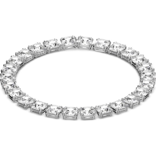 An elegant wardrobe essential, this all-around necklace is formed from clear square cut crystals on a rhodium plated prong setting and delicately finished with a hidden fastening and adjustable length. Team with other pieces from the Millenia family for evening, or wear solo with a simple T-shirt for daytime adornment with an ultramodern twist. This necklace is part of the Millenia family, designed by Creative Director Giovanna Engelbert for Collection II. How to close and open it: place the rounded baton into the widest point of the opposite hole and slide it down to the lowest point. Once in place, lower the D-ring security catch on top to secure the fastening. To open, lift up the D-ring security catch and slide the baton towards the widest point to release.