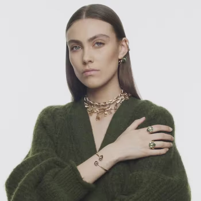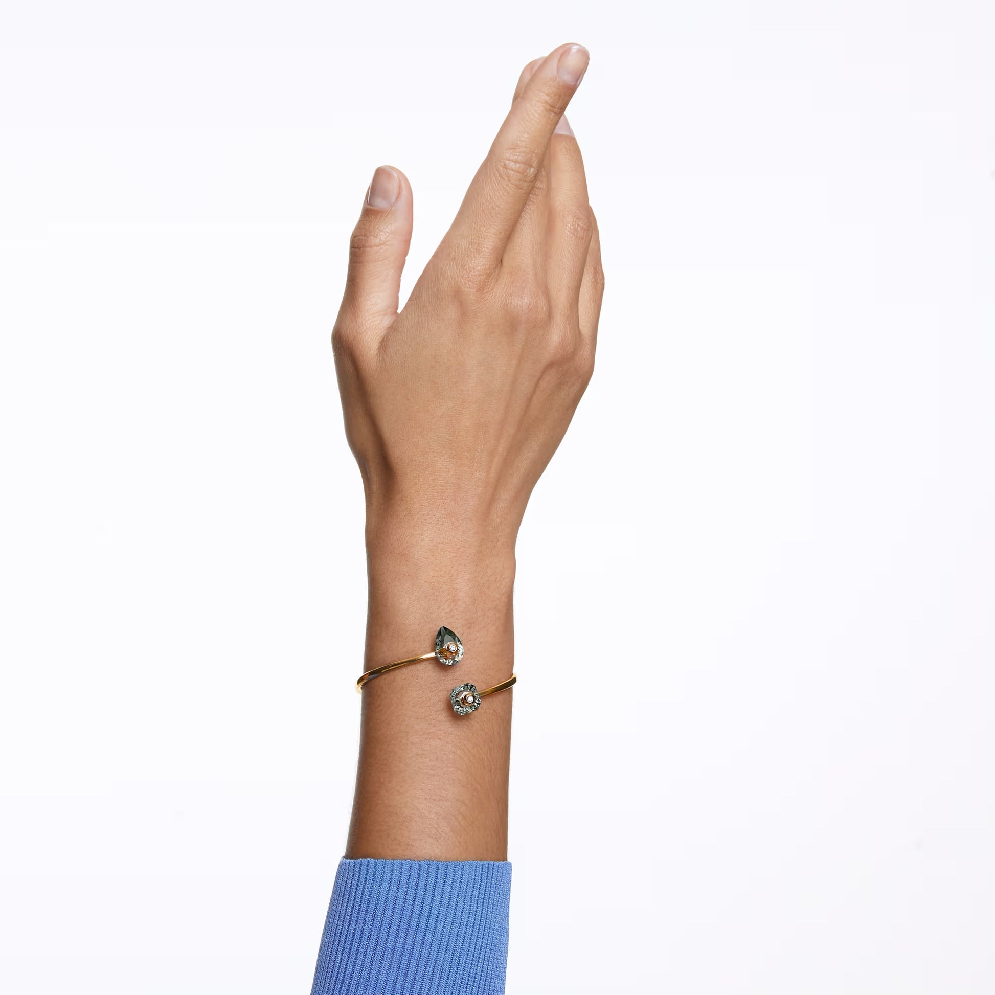 Influenced by Swarovski's industrial heritage, this elegant bangle celebrates structure and mechanical design. Set on a gold-tone plated band, it heroes two contrasting crystals in a pear and imperial cut, which are both pierced with smaller stones for a unique finish. Style yours solo, or stacked with other pieces from the Numina family for a bold everyday statement. This bangle is part of the Numina family, designed by Creative Director Giovanna Engelbert for Collection III.