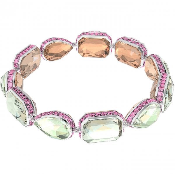 This beautiful bracelet will lend a striking pop of colour to your everyday wardrobe. Featuring a row of octagon and pear-cut crystals framed with smaller, pink, baguette-cut crystals, its innovative reversible design means you can choose between green or orange as the focal hue. Finished on a rhodium-plated setting with invisible closures, style this elegant piece with the matching necklace for a uniquely chic statement. This bracelet is part of the Orbita family, designed by Creative Director Giovanna Engelbert for Collection III. How to close and open it: to close, place one magnet on top of the other and slot together. To open, locate the small indent on the side of the magnetic closure, slide your fingernail in and pop it open.