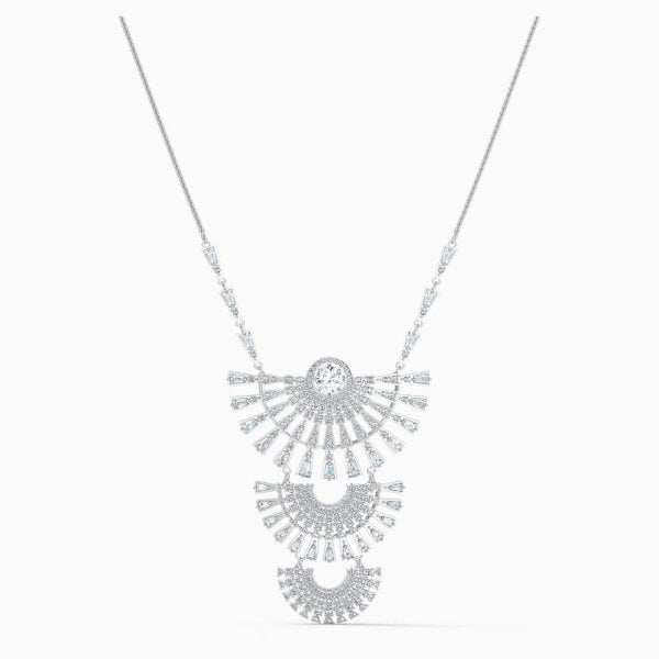 This masterful necklace by Swarovski is a display of timeless beauty, opulence, and sparkling exuberance. A shimmering, delicately faceted white stone is the center of attention, dancing in a circle of sparkling facets. Glittering stones and brilliant crystals are layered below it in three fan shapes, each one featuring a dazzling arrangement of stones in round and tapered baguette-cuts as well as round crystals. Matching stones also adorn the glittering chain closing with an adjustable sliding closure. A stunning talking piece that is ideal for special occasions, especially worn together with the matching earrings and bracelet for a truly spectacular ensemble.