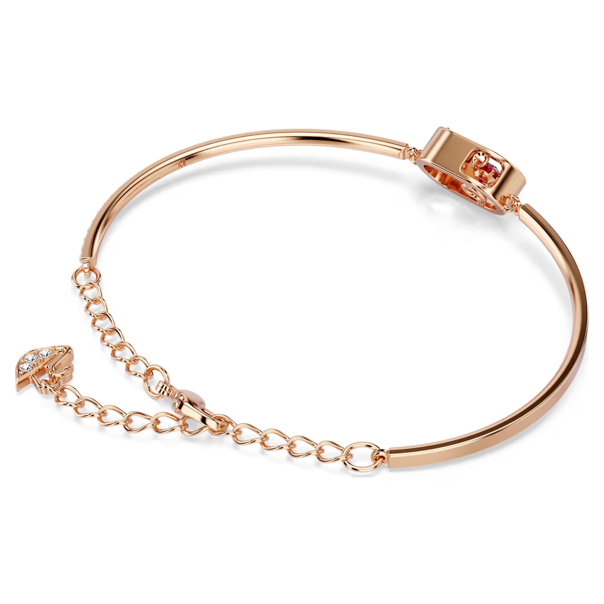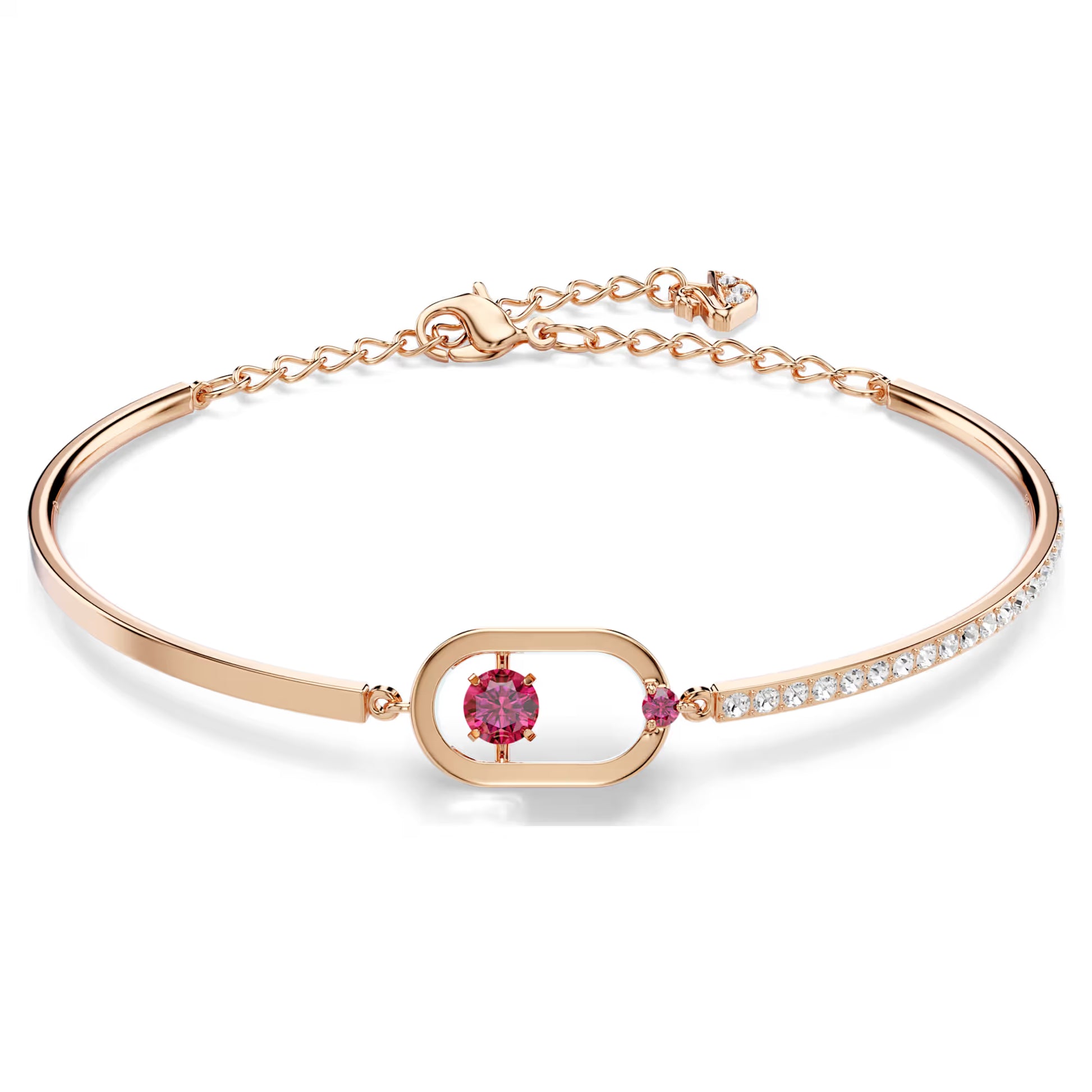 An essential addition to your jewellery collection, this bracelet will bring playful shine to your look. Showcasing Swarovski's 'dancing stone' concept, its focal point is a sparkling, round stone in vibrant red that appears to float inside its metal surrounding. Colourful craftsmanship and modern design meet in this eye-catching design.
