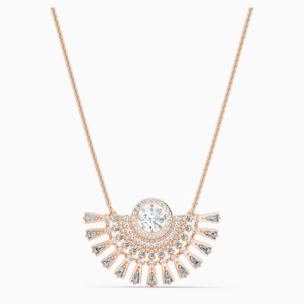 Refined opulence defines this resplendent Swarovski necklace, its design characterized by timeless beauty and sophistication. A white dancing stone is its highlight, with rays of gleaming gray stones and clear crystals in different sizes radiating out from it and adding their own sparkle to its gleam. The necklace closes with a lobster clasp, its timeless design perfect for special occasions and layering with matching necklaces.