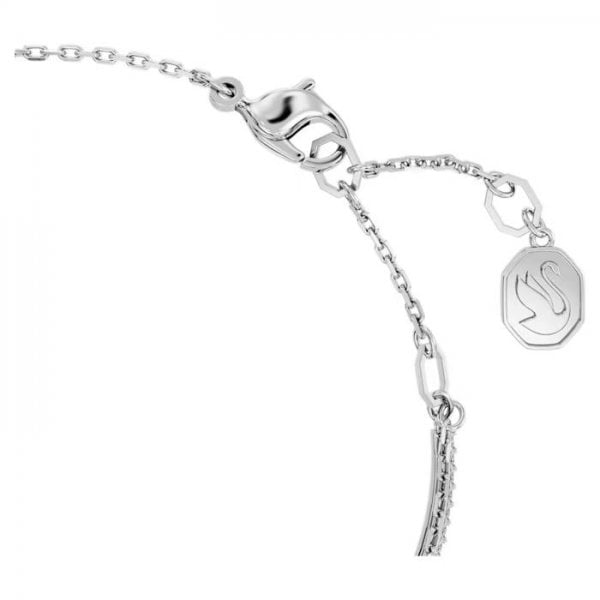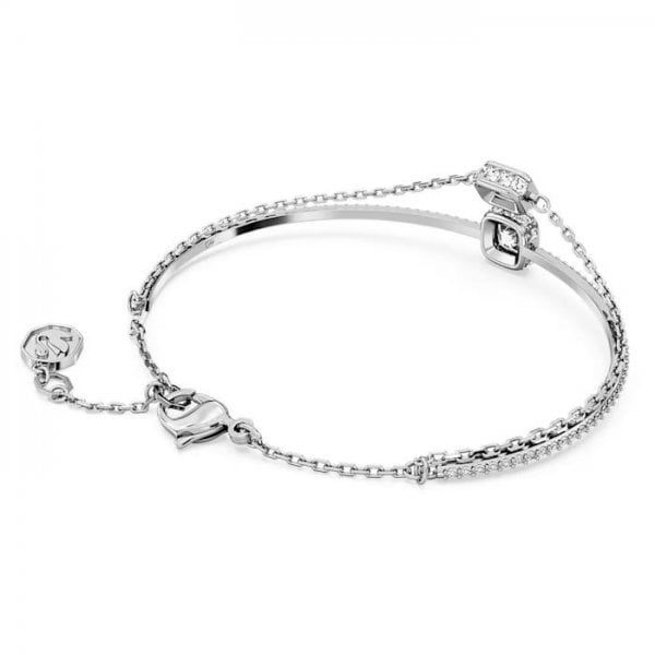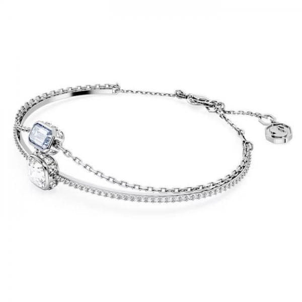 Enjoy two styles in one with this fascinating Stilla bangle. The rhodium plated design features a solid band embellished with clear crystals and a clear stone at the centre, while the soft chain holds a rectangular-shaped Swarovski Zirconia in blue. Both stones are surrounded by clear square-cut crystals on the sides for added radiance. The piece has a lobster closure with an elongation for an adjustable fit. Inspired by drops of light, this beautiful bangle is the epitome of understated glamour.