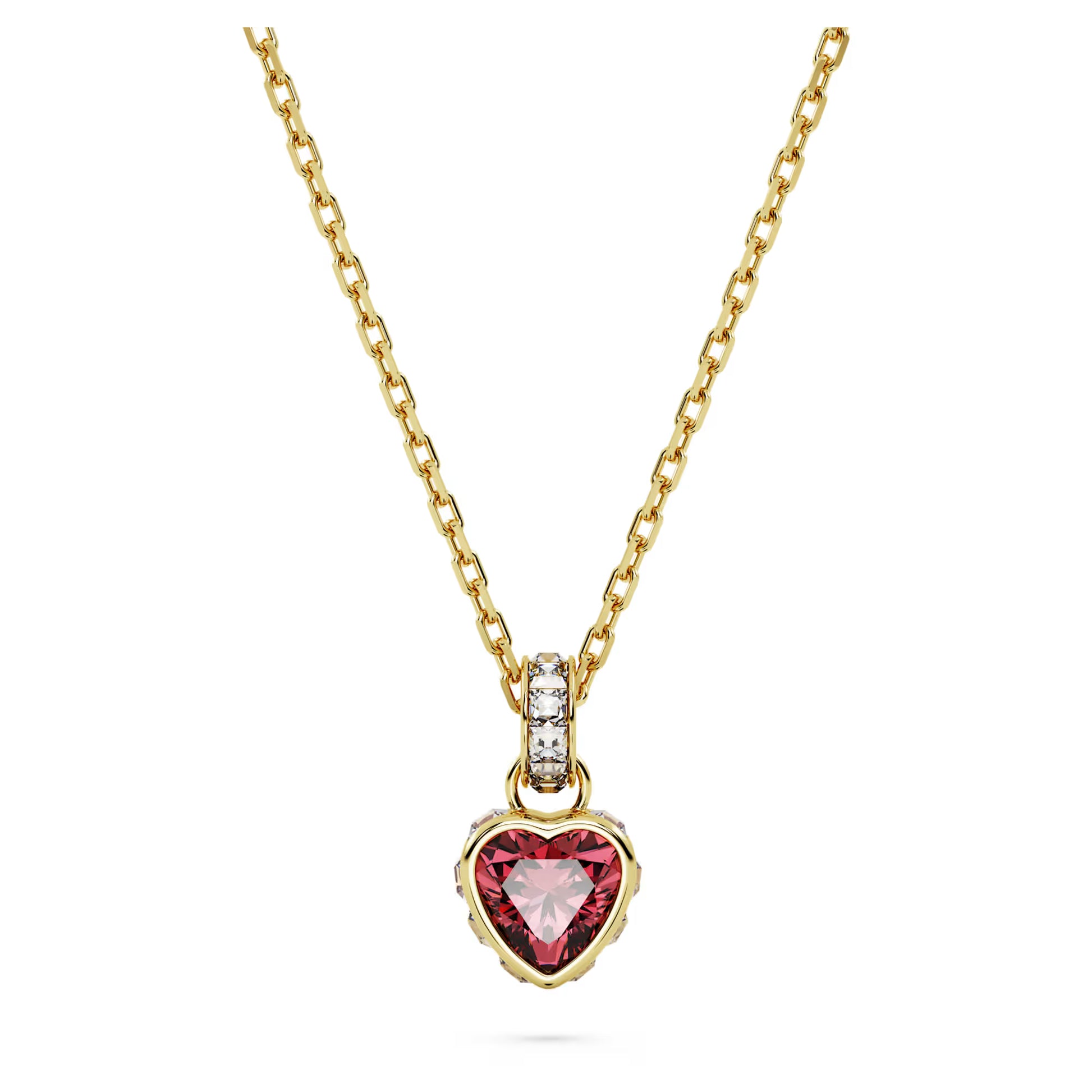 If you adore heart-shaped jewellery, this pendant from the Chroma family is essential for your collection. The red centrestone sits in a gold-tone plated surround enhanced with square clear crystals around the edges and the bail. Beautifully attached to a gold-tone plated chain with a round stone detail at the end and a 5cm elongation, this is a piece you can wear every day, making it a signature part of your style.
