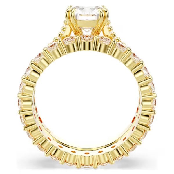 Reflecting the beauty of the cosmos, this spectacular jewellery inhabits its own light-filled universe. The gold-tone plated design combines a band ring adorned in pavé with a solitaire ring, also featuring pavé, with a large Swarovski Zirconia at the centre. A radiant gift that beautifully captures Swarovski’s signature savoir-faire.