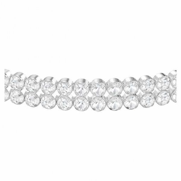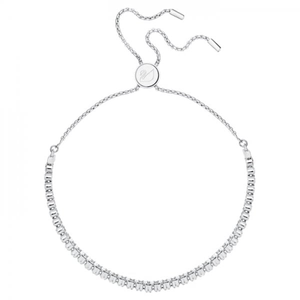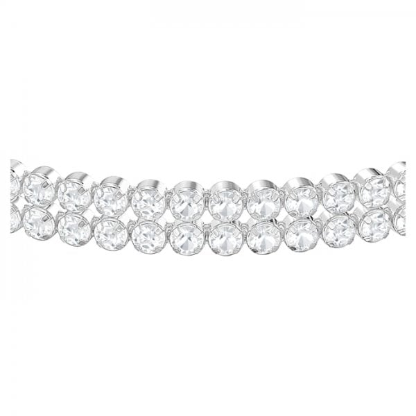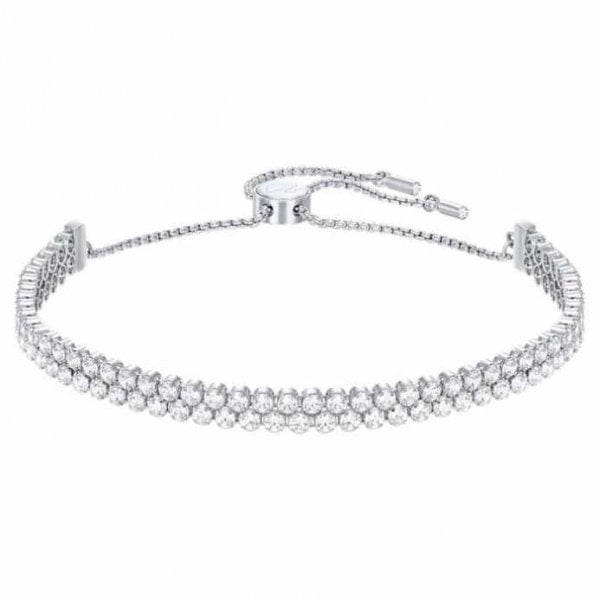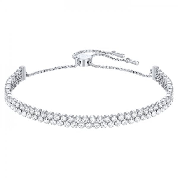 This timeless rhodium-plated bracelet is an ideal gift for lovers of sparkle. Two delicate strands of clear stones are set in a new cupchain design. Draping beautifully on the wrist, the bracelet is finished with an innovative new sliding ball closure, which ensures the customer can easily adjust the size for the perfect fit. Pretty and understated, its also a bold statement of elegance. Wear with a Swarovski watch for daytime sparkle, or dial up the glamour for a night out by layering with contrasting styles.