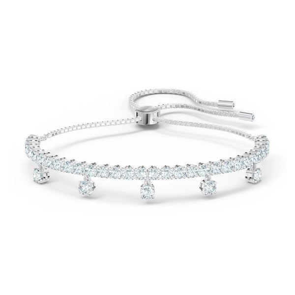 This attractive bracelet by Swarovski radiates stylish coolness. A row of sparkling white stones adorns the bracelet, with several additional stones dangling from it, accentuating the design. The bracelet closes with an adjustable sliding closure and combines well with matching stackable bracelets. A brilliant yet casual look, perfect to dress-up everyday outfits.