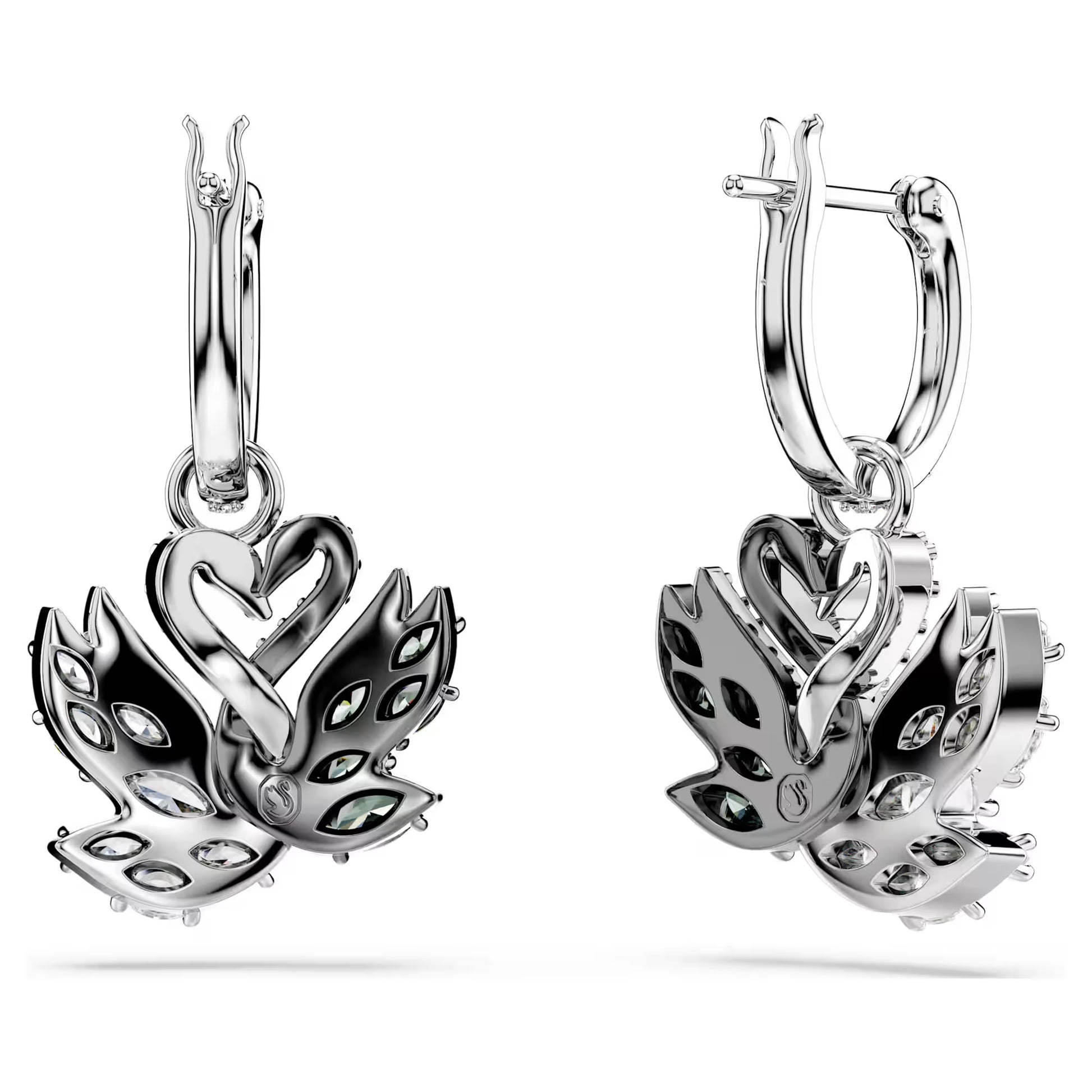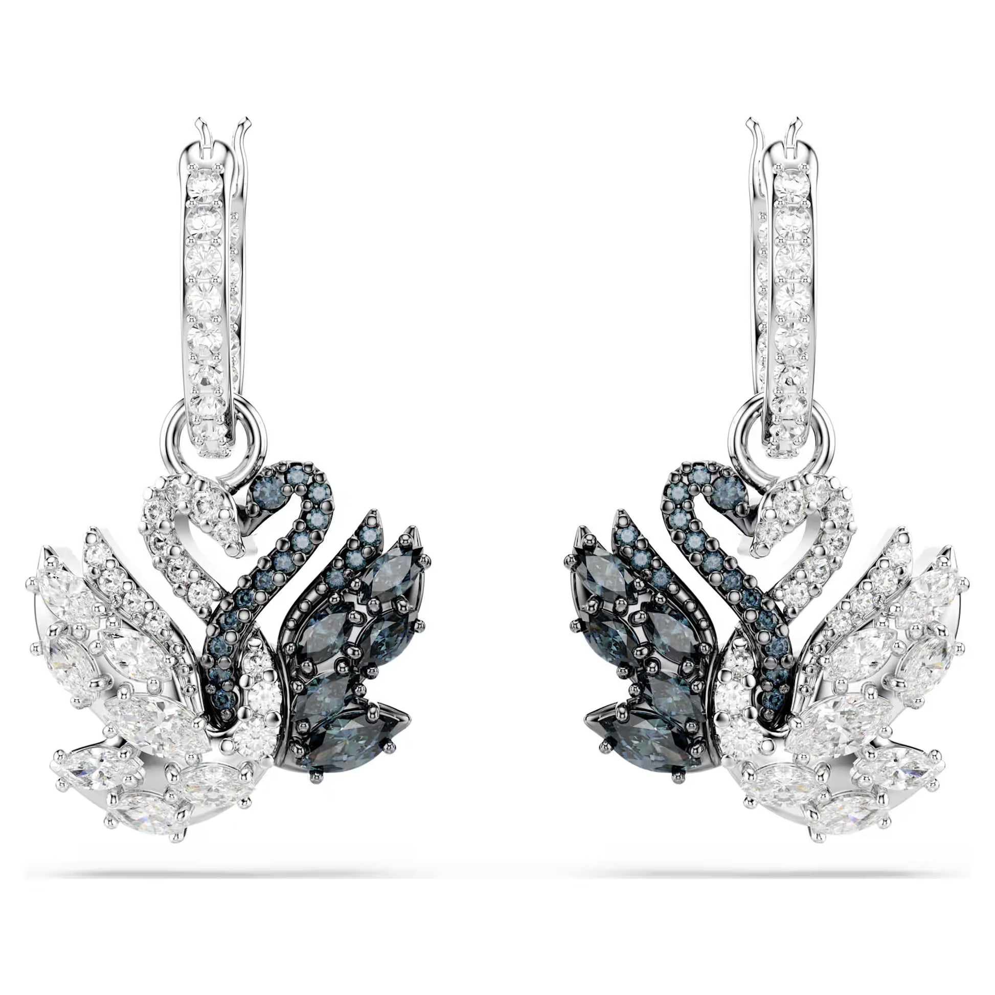 Beauty takes flight in these emblematic pierced earrings, crafted in tribute to Swarovski’s iconic swan logo. Hanging from delicate pavé hoops, each piece features two intertwined swans, in rhodium and ruthenium plating, with an all-over decoration of black and white Swarovski Zirconia in round and marquise cuts. Add these revered silhouettes to your style for a pure touch of elegance.