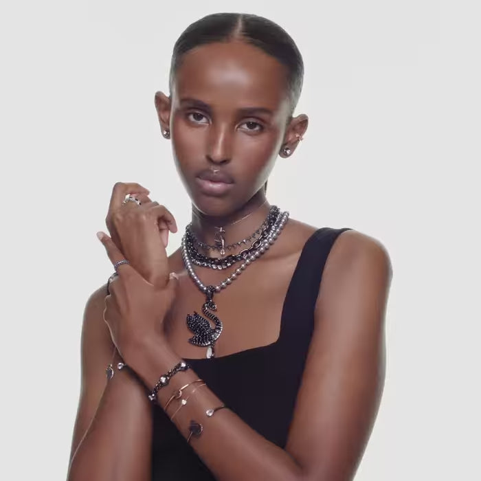 Adorn your wrist with the beauty of Swarovski’s signature emblem. This rose gold-tone plated jewelry features a rigid band with an elegant swan motif, expertly decorated with a pavé of jet black Swarovski ReCreated™ crystals. A secondary chain is also attached with a clear Swarovski Zirconia at the center. Intense yet radiant, this bangle is a perfect way to inject your style with intrigue.