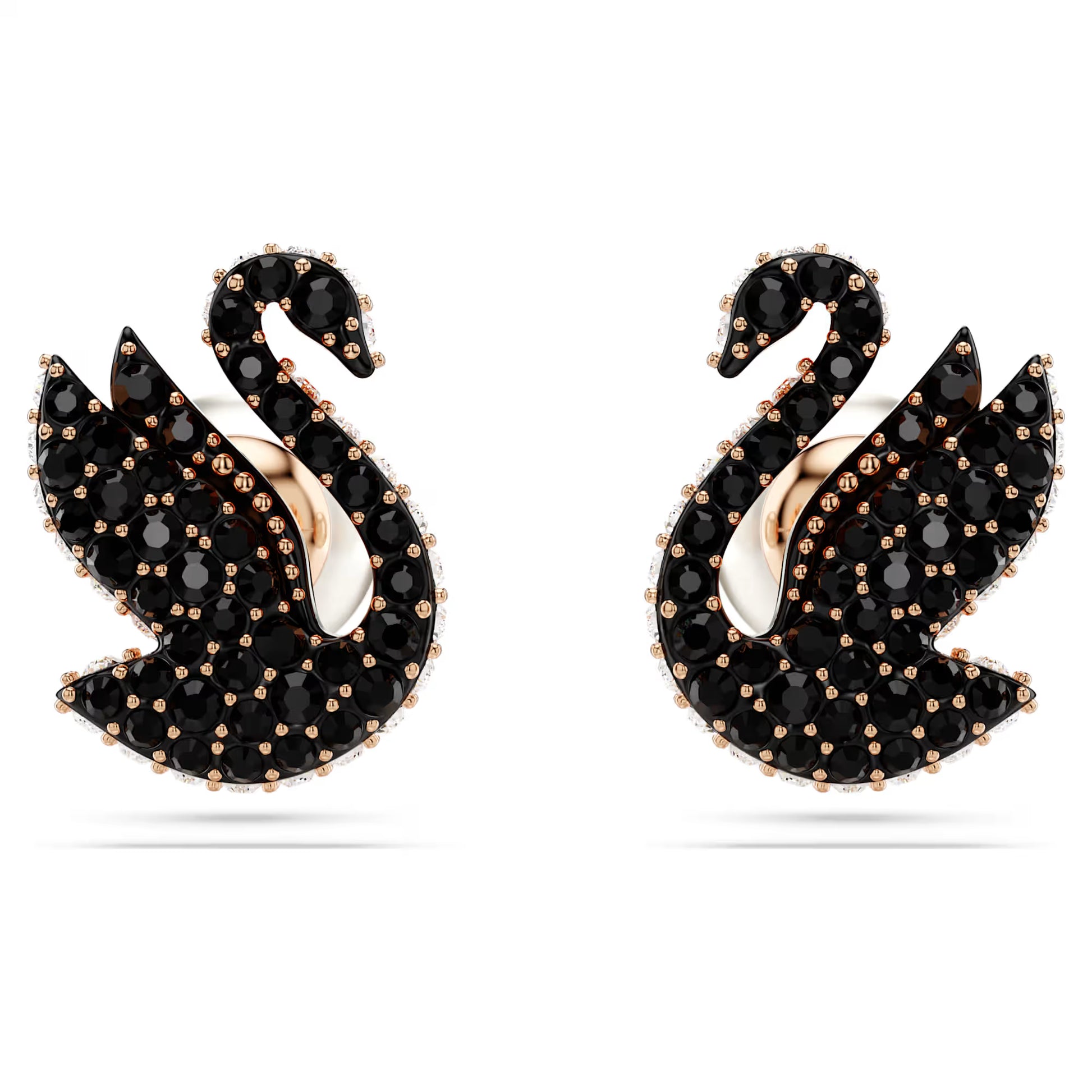Inspired by the signature emblem of Swarovski, these elegant earrings reveal a swan preparing to take flight. Each rose gold-tone plated piece features a single Crystal Pearl closure, along with a swan motif, expertly decorated with a pavé of jet black Swarovski ReCreated™ crystals. These sophisticated earrings can be worn alone or paired with a matching pendant for maximum glamour.