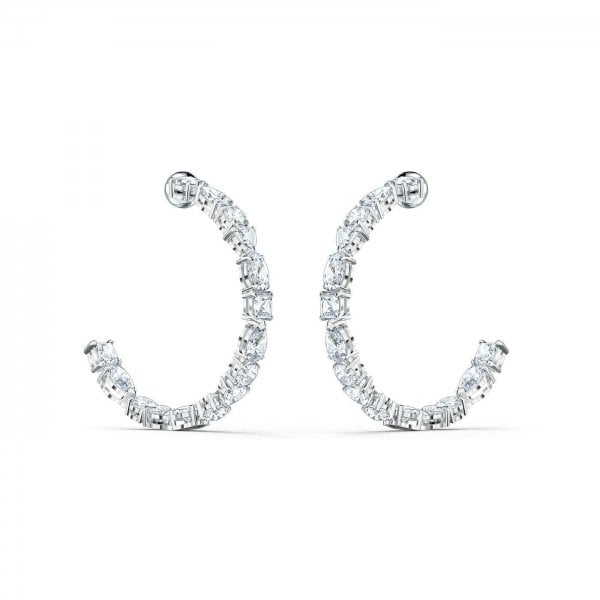 This pair of pierced earrings by Swarovski is characterized by simple silhouettes and resplendent elegance. Each hoop is formed by a row of gleaming white stones, expertly cut into sparkling, faceted round, square, trillian, and drop shapes. A timeless addition to your everyday look, these earrings are easy to combine with matching pieces of jewelry. A beautiful gift giving idea.