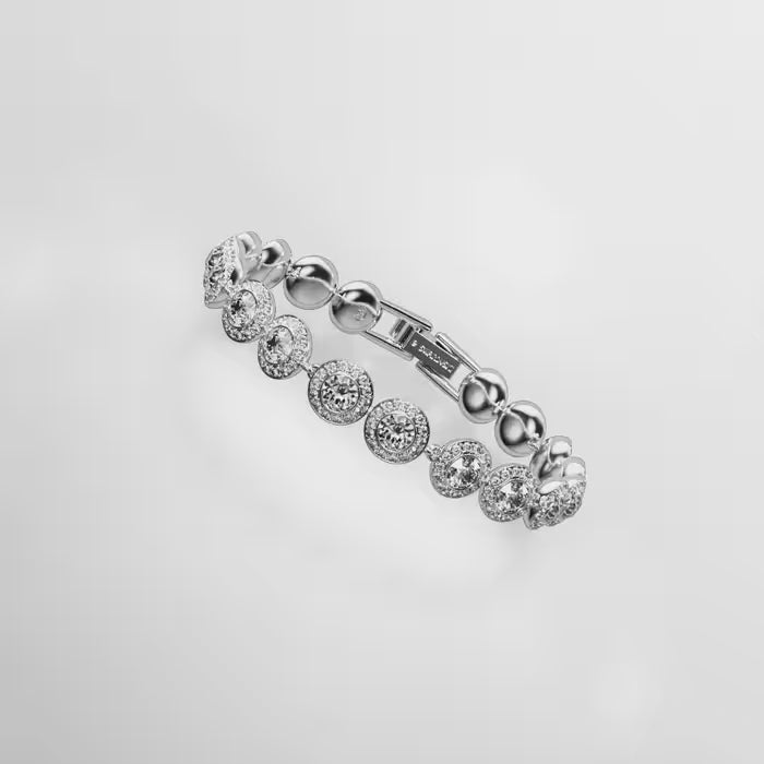 Wrap your wrist in light with this luminous Una bracelet. The rhodium plated design features individual links, each set with a brilliant central crystal and a halo of smaller round-cut crystals. An ethereally elegant choice that can be paired with matching pieces from the same family.