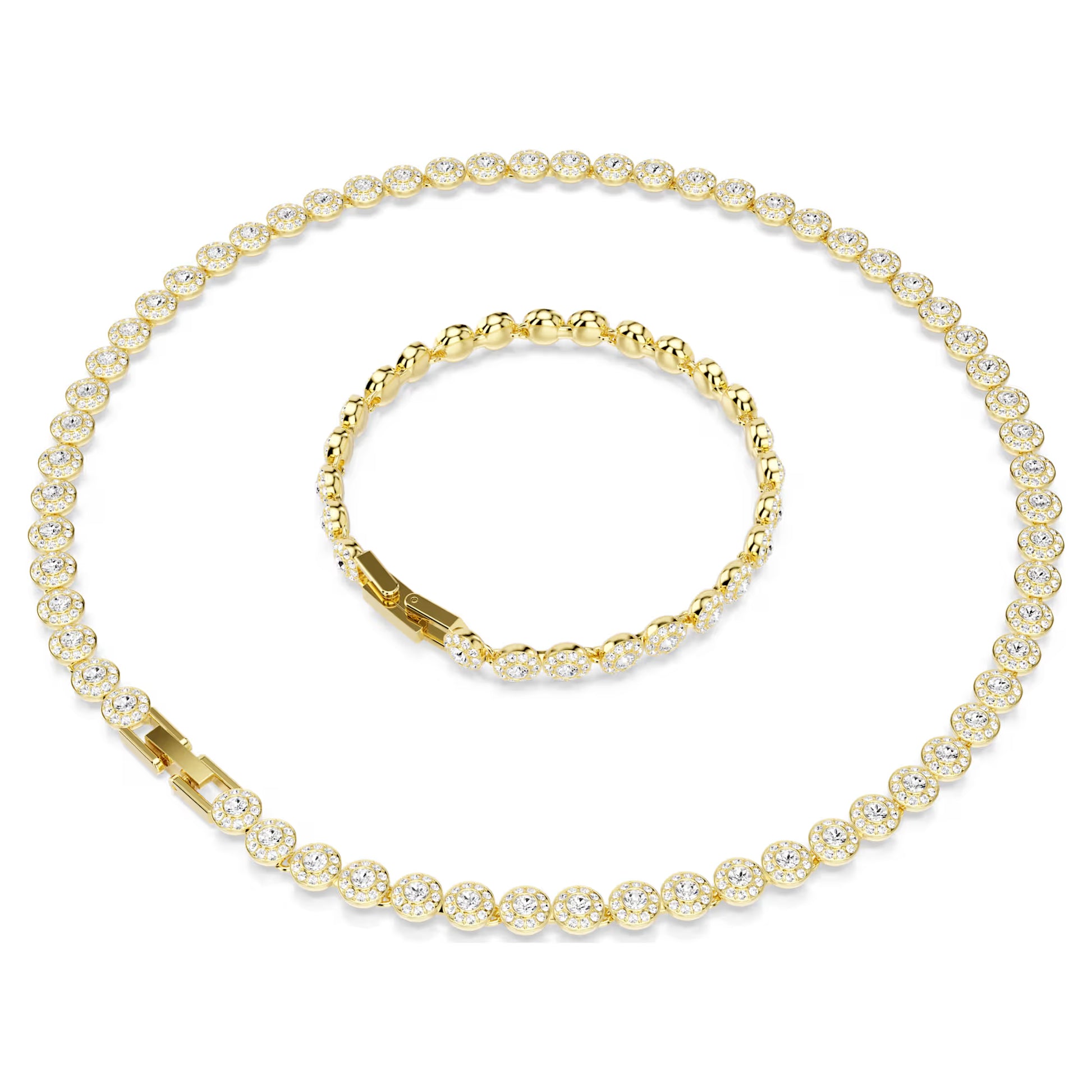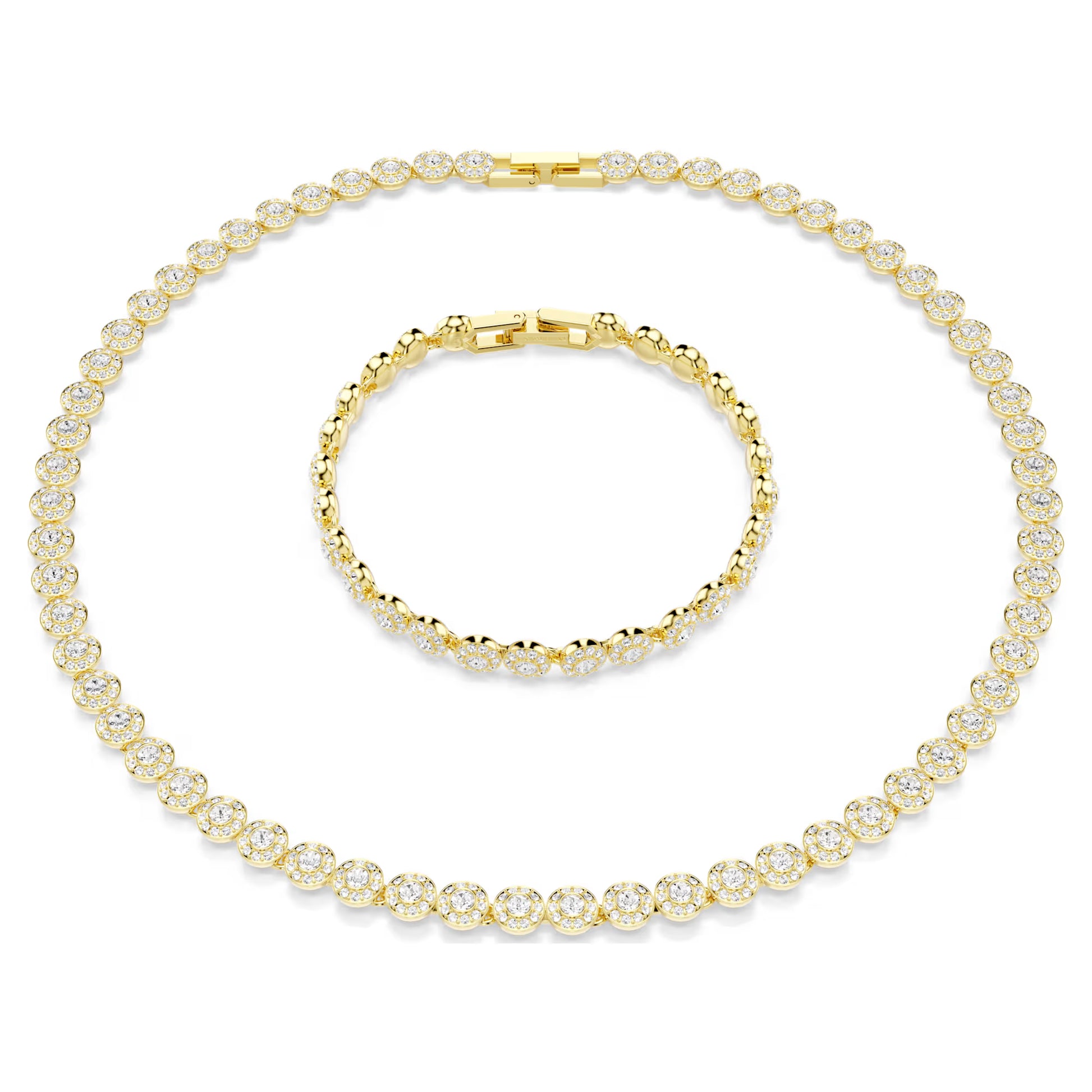 Harmonising luxury throughout your style, this gold-tone plated set was born to shine. Each piece features a full surround of round-cut crystals, each framed by a halo of clear pavé. This includes the dainty motifs on both the necklace and the bracelet. The foldover clasps deliver a seamless closure, while the additional extenders mean you can adjust the jewellery for both comfort and size. Wear these pieces together whenever you need a look of all-over glamour.