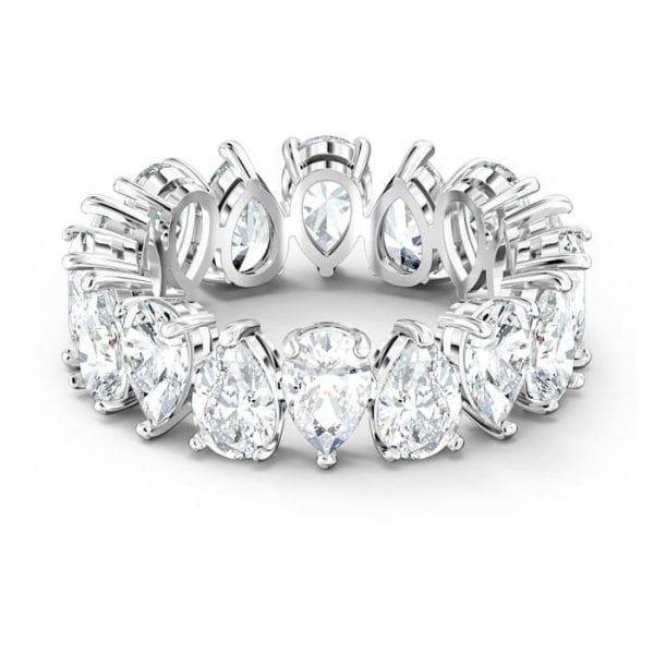 This ring by Swarovski showcases the sparkling beauty of gleaming, faceted stones. White, drop-shaped elements arrayed in a single row beautifully reflect and refract incoming light. Its puristic, elegant forms make this ring perfect for combination with