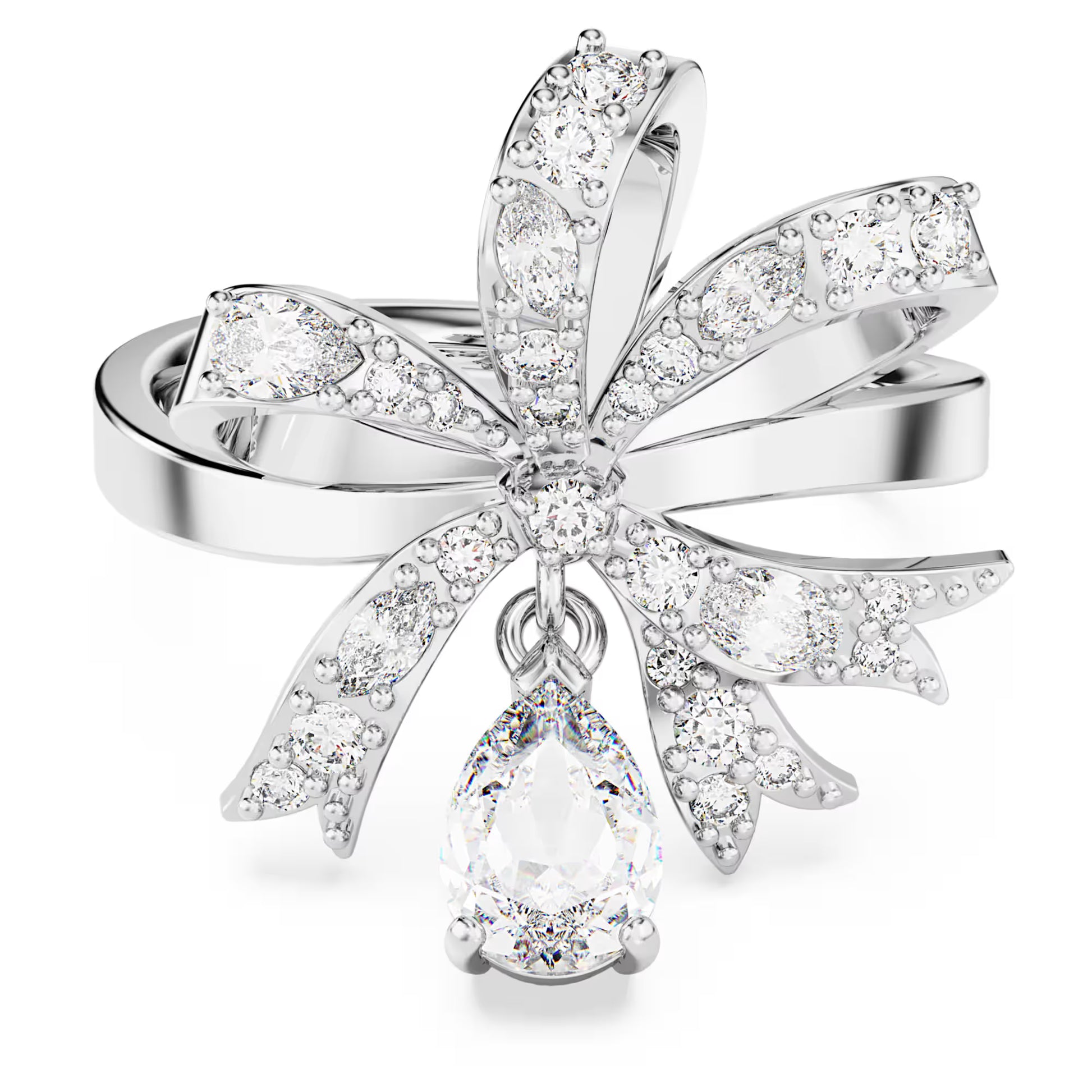 Placing a ribbon around your finger, this unique Hyperbola cocktail ring feels like a gift every time you put it on. The bow-inspired design is rhodium plated, with an array of bright clear crystals, set in place using the chattonage technique. Two delicate stones also add to the effect with a round stone at the centre of the bow, and a separate pear-shaped embellishment which hangs beneath. Wear this ring for a touch of modern elegance, or present it as the perfect romantic gift.