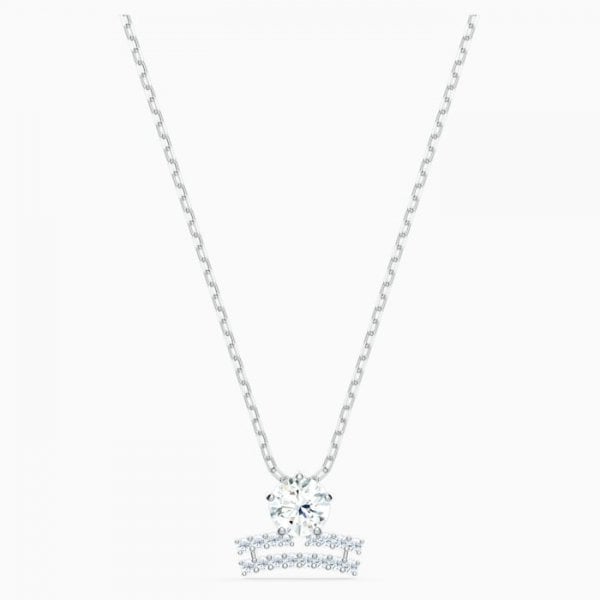 This pendant by Swarovski is inspired by the sign of Libra. Representing harmony and balance, the carefully balanced lines of the sign are traced in sparkling clear crystal pavé and centered around a white stone, evoking the stars of the zodiac. The compl