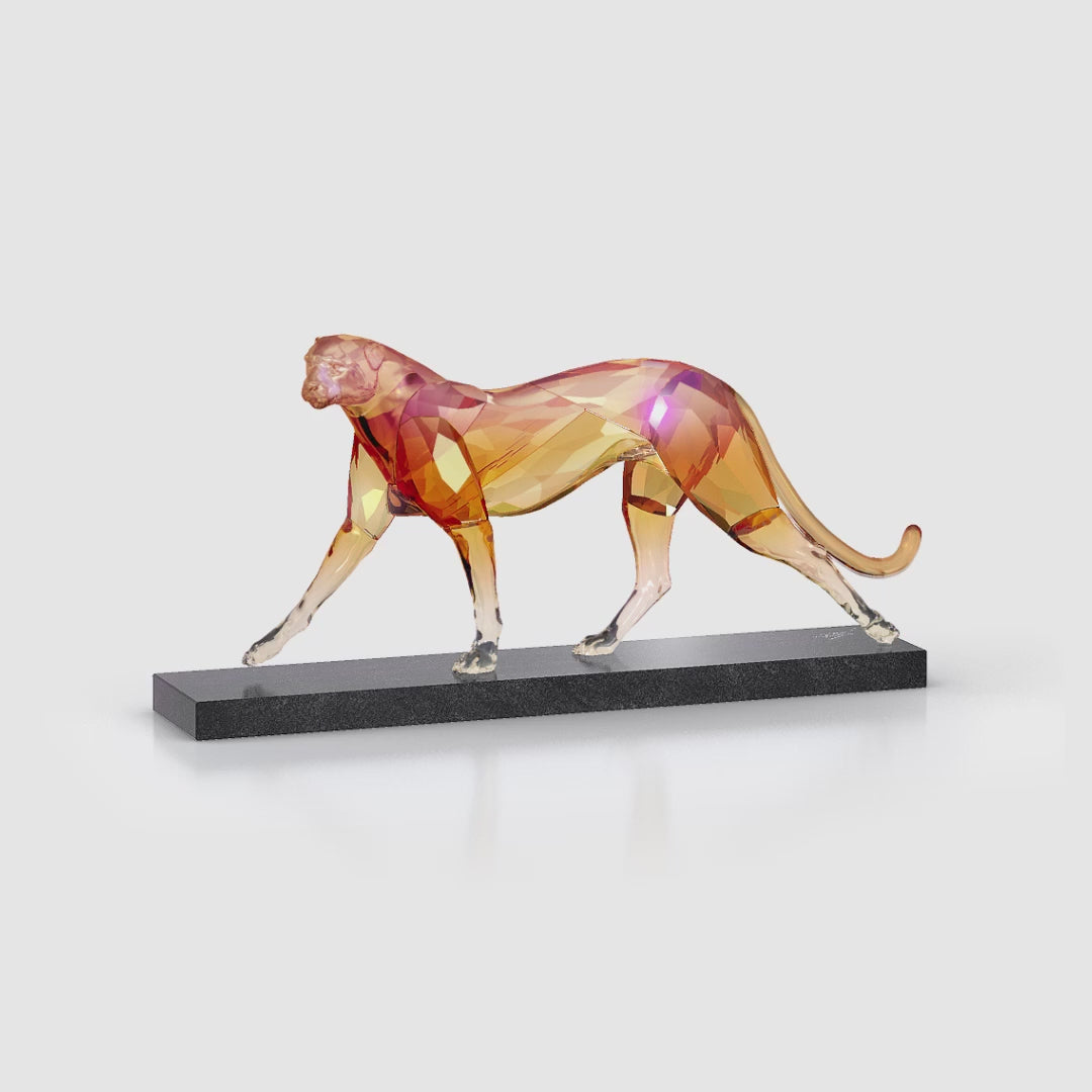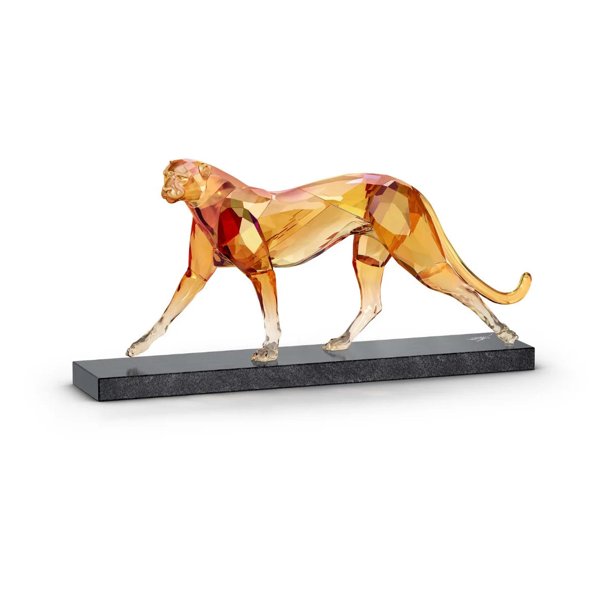 Slender and powerful, this cheetah figurine is a limited-edition design of just 1000 pieces. Each of its stunning 739 facets is a bold example of our master cutting and perfectly illustrates the agile and beautiful form of the animal. Created in a golden yellow colour and coated with a unique Savanne effect, the figurine is set on a sleek base featuring the Swarovski logo, the limited-edition number, and the designers signature. This a statement piece that celebrates this incredible animal while also highlighting the importance of protecting its fragile habitat. Decoration object. Not a toy. Not suitable for children under 15.