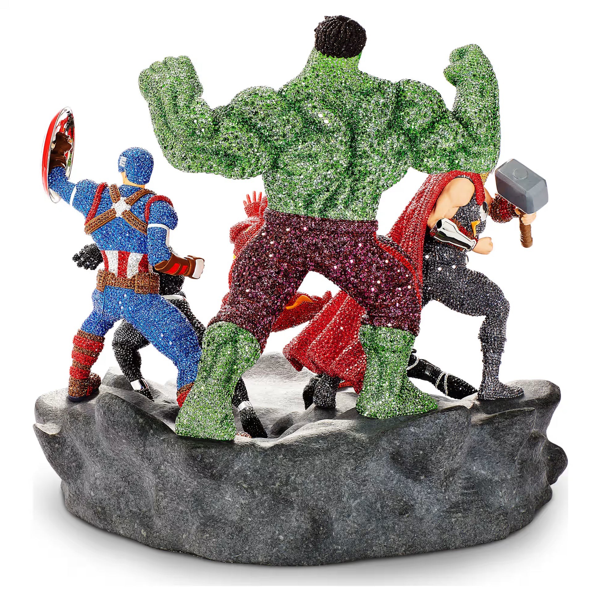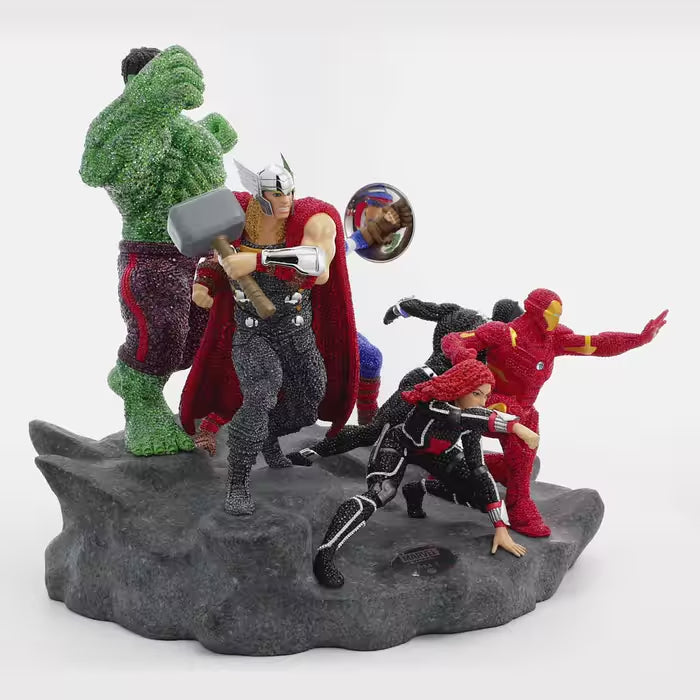 For the very first time, Swarovski has assembled a full squad of Super Heroes, all standing together in one astonishing display. Made for Marvel fans, this empowering Limited Edition creation features Thor, Black Widow, Hulk, Iron Man, Captain America and Black Panther, each rushing to the rescue in an explosion of bright colours. The design requires 542 hours of craftsmanship and is produced with approximately 63,900 crystals, expertly set in place using the Pointiage technique. This dramatic and dynamic Avengers scene is limited to 200 pieces and is one of the most meticulous and spectacular examples of Swarovski savoir-faire ever produced. A collectible that will inspire your adventurous side every day. Decoration object. Not a toy. Not suitable for children under 15.