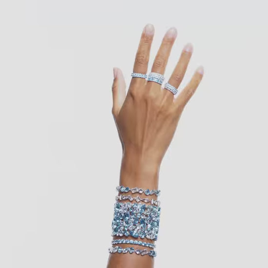 Surround your wrist in vibrant jewels with this glittering bracelet from the Matrix Tennis family. In perfectly formed fluidity, the design features a row of round stones in light aquamarine on a rhodium plated setting for a cool combination. Wear it alone, or pair it with other pieces from the Matrix Tennis family.