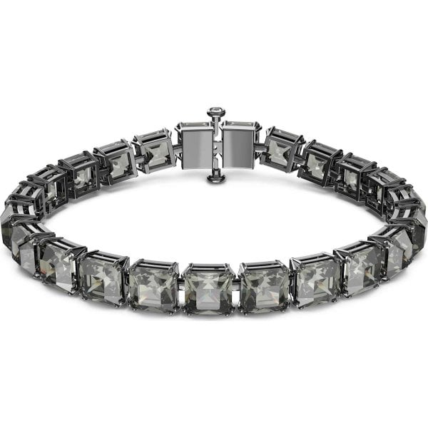 Encapsulating Daniel Swarovskis vision to create timeless jewelry for every woman, this elegant bracelet is a true forever piece. Formed from a fluid row of square cut gray crystals, this articulated design is finished with a concealed closure and ruthenium-plated setting. Wear yours with the matching necklace for a sophisticated day-to-night pairing. This bracelet is part of the Millenia family, designed by Creative Director Giovanna Engelbert for Collection II. How to close and open it: slide the hooks into the corresponding holes at the base of the end stone and push to click into place. Fasten the security chain using the small lever clasp. To open, unfasten the security chain and press the buttons on either side of the stone at the same time to release the hooks.