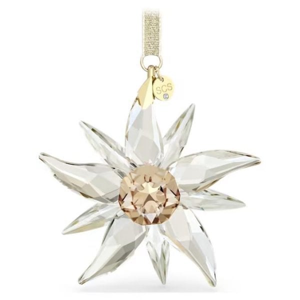 Created exclusively for SCS members, this delicate edelweiss motif is a tribute to Swarovski’s origins when the prettiest of alpine flowers was the company’s logo. A beautiful example of Swarovski's savoir-faire, the piece is expertly cut from 239 facets and features elegant silver and golden shades. The flower is suspended on a golden lamé ribbon with a gold-tone plated tag engraved with "SCS" and embellished with a single chaton. A radiant piece that will bring joyful nature into your home. Decoration object. Not a toy. Not suitable for children under 15.
