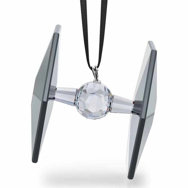 Our growing collection of iconic Star Wars vehicles now includes the TIE Fighter, the unforgettable symbol of the Imperial fleet. Crafted from grey and clear crystal, it sparkles from all sides with 246 expertly crafted facets. The design also features polished metal accents and a black satin ribbon, enabling you to hang it up and add an interesting new dimension to your collection. A must for Star Wars fans and a great gift idea. Decoration object. Not a toy. Not suitable for children under 15.
