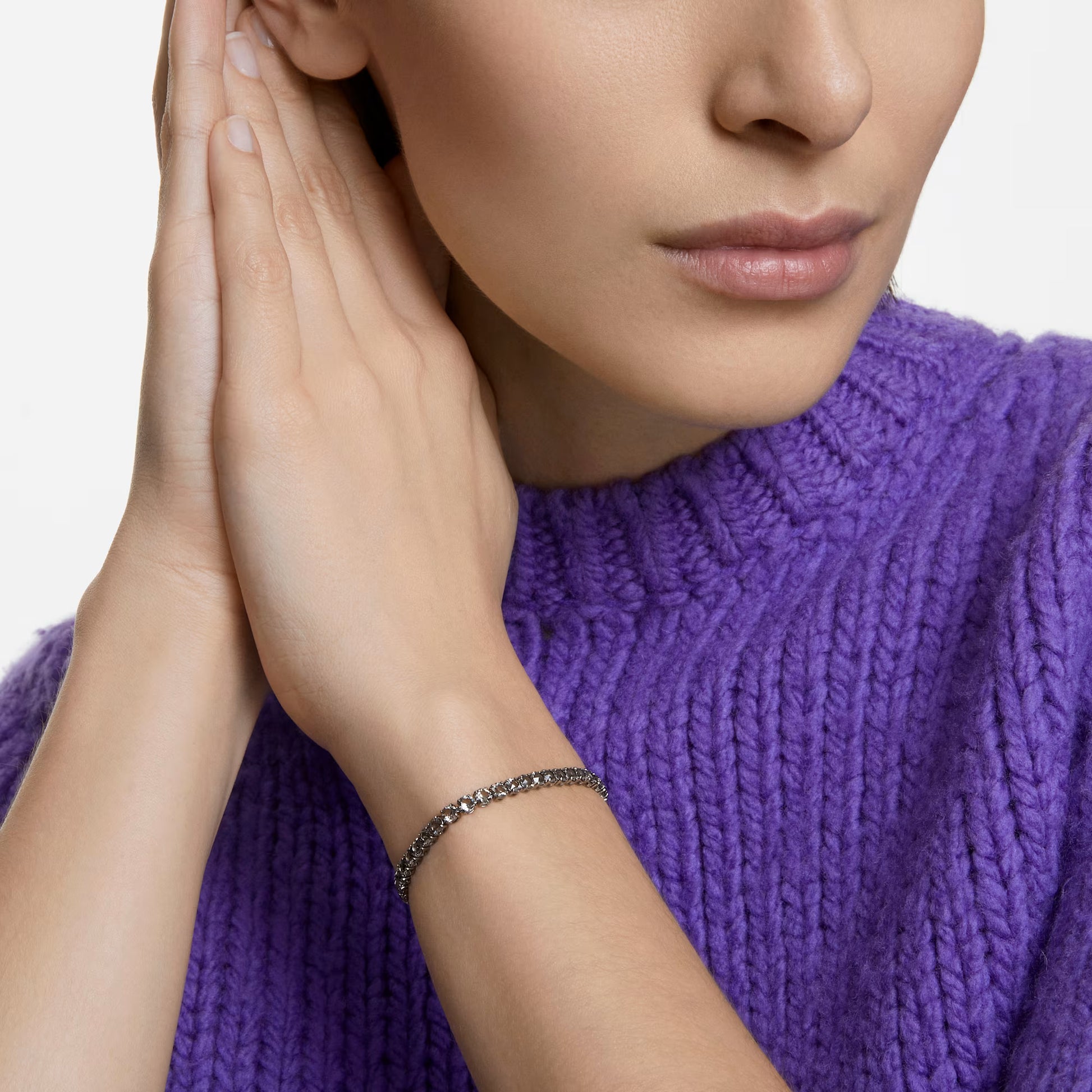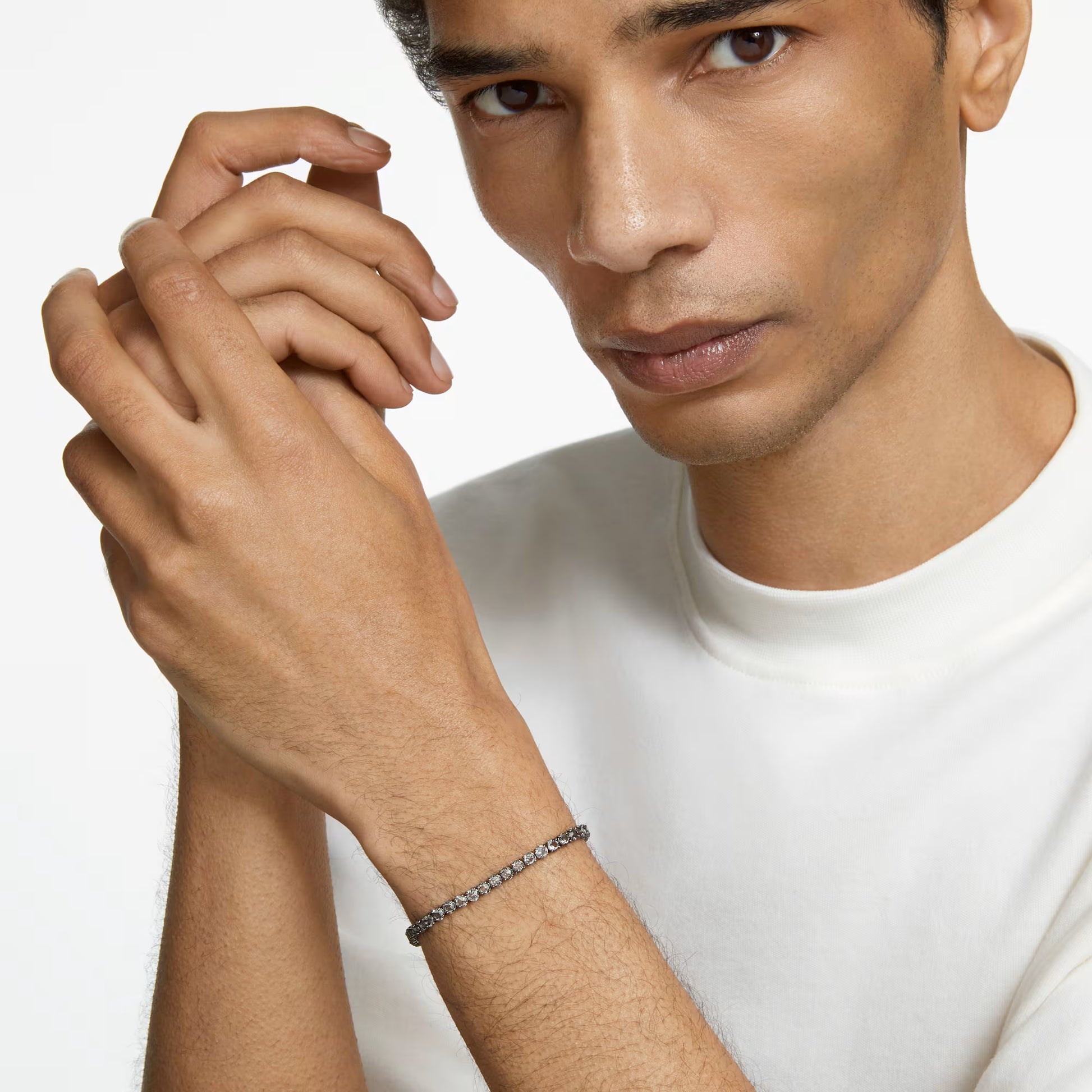 Full of subtle sparkle and contemporary edge, this classic ruthenium plated Tennis Bracelet can be dressed up or down. It features a delicate strand of prong-set round crystals in a dark grey colour. An elegant and minimalistic must-have for everyday wear.