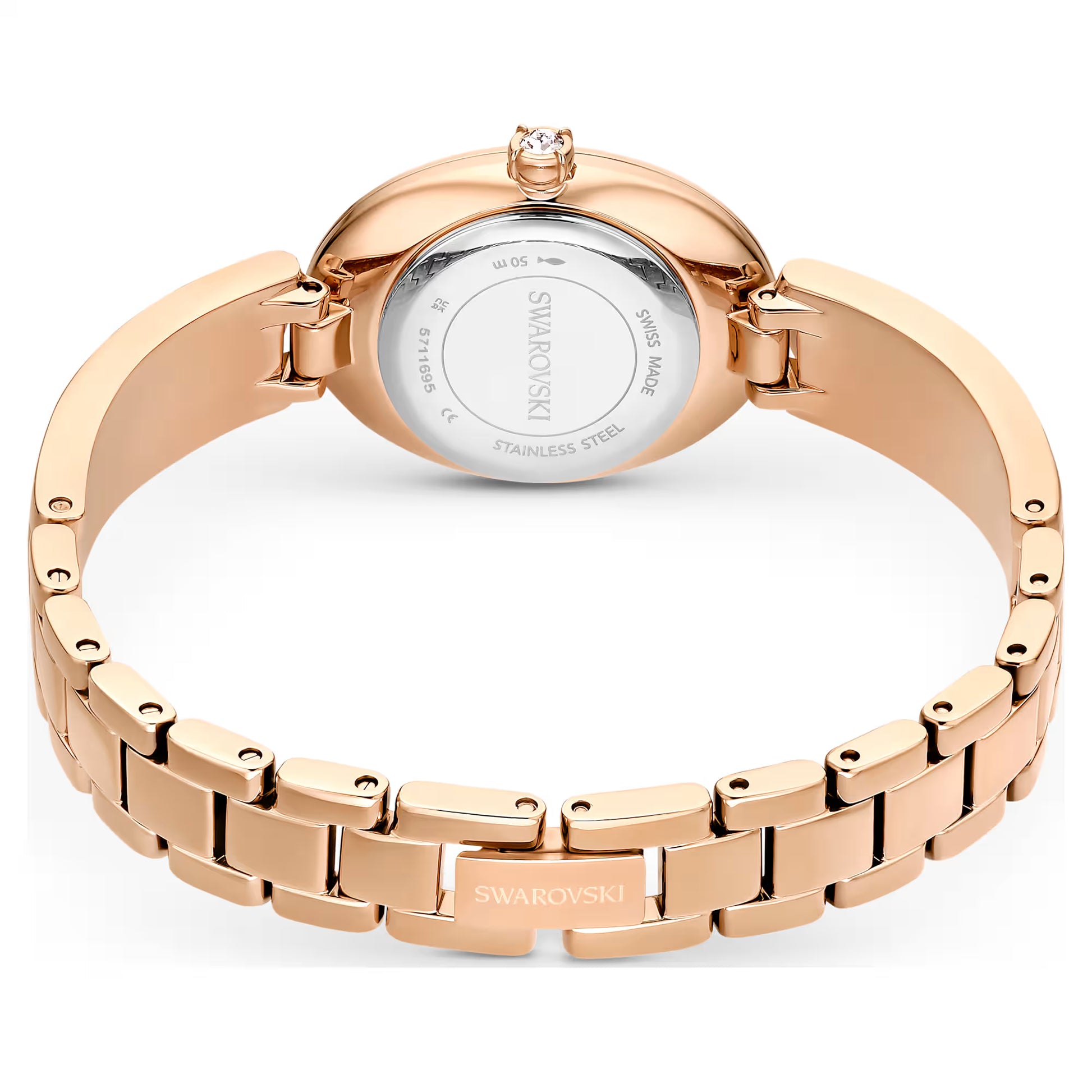 This Crystal Rock Oval watch is crafted for sensational glamour. The elegant oval case is 26mm x 29mm and is made with a beautiful rose gold-tone finish. Beneath the faceted glass, a grey sunray dial features 11 crystal hour markers and the Swarovski swan at 12 o’clock, while a single stone is set in the watch’s crown. The case is set on an adjustable metal bracelet that has been adorned with Ultra Fine Crystal Rocks in a metallic grey colour. This Swiss made watch is water resistant to 50m and is designed to keep you on time for everyday occasions with an inherent sophistication.