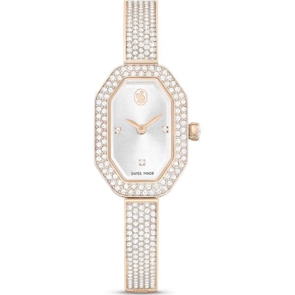 Capturing the beauty of Swarovski’s iconic octagon shape, this Dextera bangle watch offers a meticulous display of symmetry around the wrist. The 20mm x 30.5mm case features a champagne gold-tone finish and is adorned with a pavé of 92 crystals on the bezel. This provides a perfect frame for the sunray dial, which features a swan logo at 12 o’clock and three crystallized index markers. Along with a single dazzling stone set in the crown, the watch is also brought to life by 194 crystals set along the adjustable bracelet, providing exceptional beauty at every hour. This Swiss made watch is water resistant to 30m and combines joyful extravagance with signature Swarovski savoir-faire.