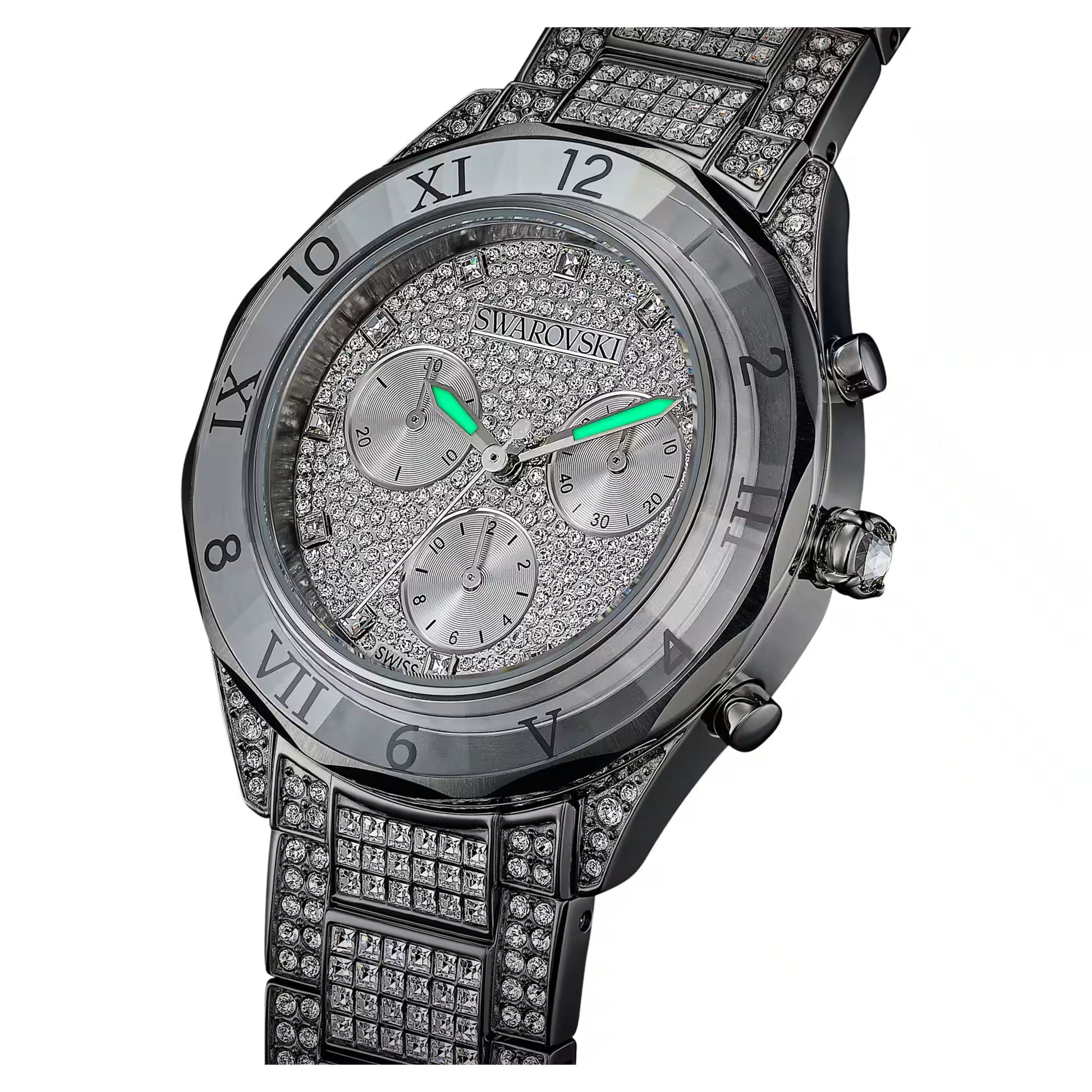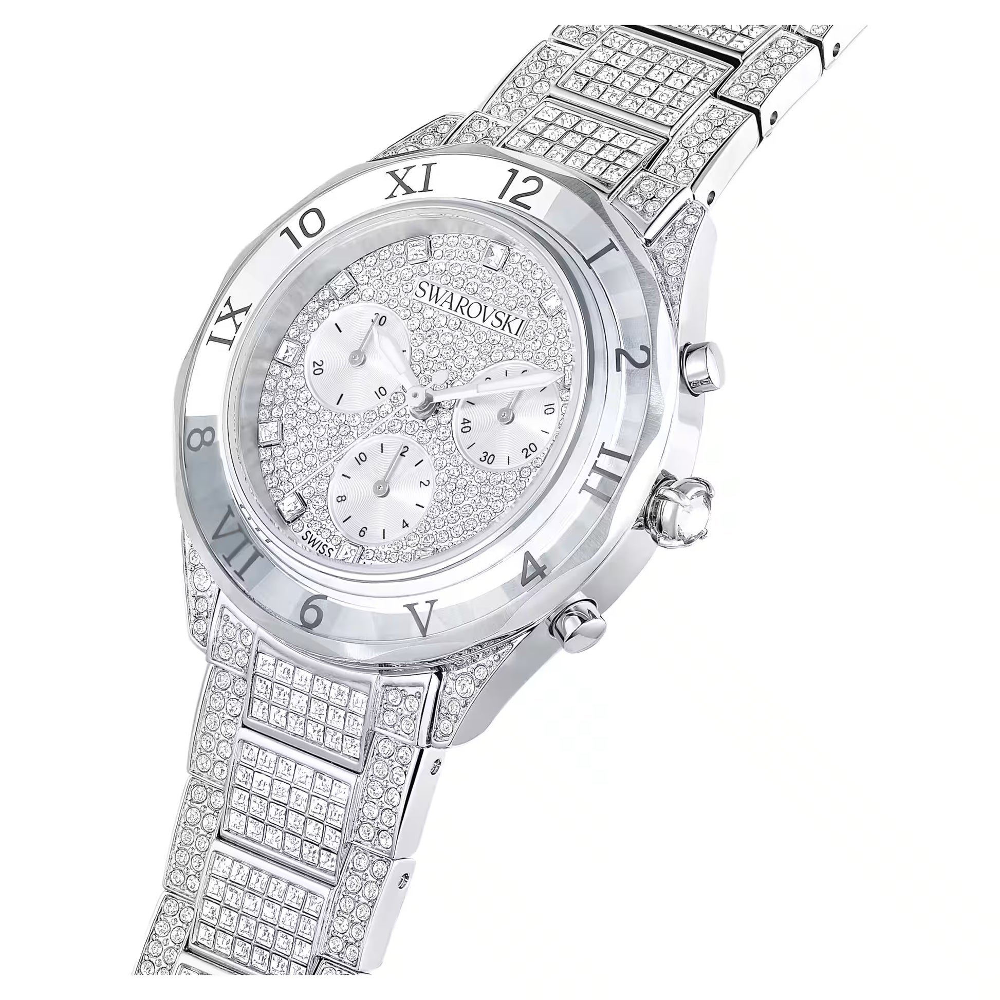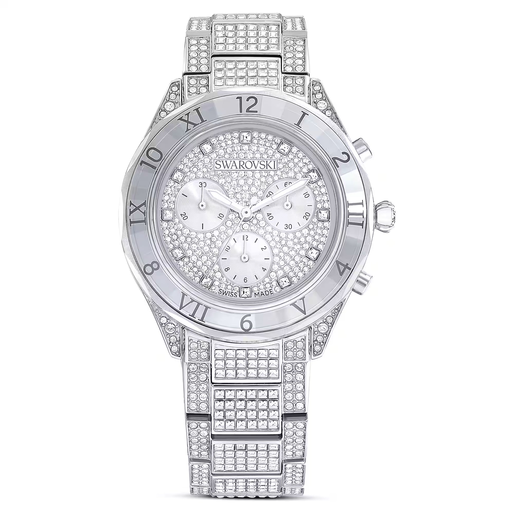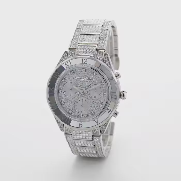 A truly dazzling ode to Swarovski savoir-faire, this iced-out Dextera timepiece radiates brilliance every hour. The 40mm stainless steel case is mounted with a crystallised bezel, cut to reflect the light. Most strikingly, the chronograph dial is embellished with 240 round-cut crystals and three subdials including a minutes counter, seconds counter and hours counter. For maximum shine, the index markers are indicated with individual crystals and the hands are coated in bright Luminova. The case itself is encrusted with 40 crystals, with a single crystal set in the crown, and a total of 492 crystals adorn the stainless steel bracelet. This Swiss made watch is water resistant to 50 metres and exudes joyful extravagance.
