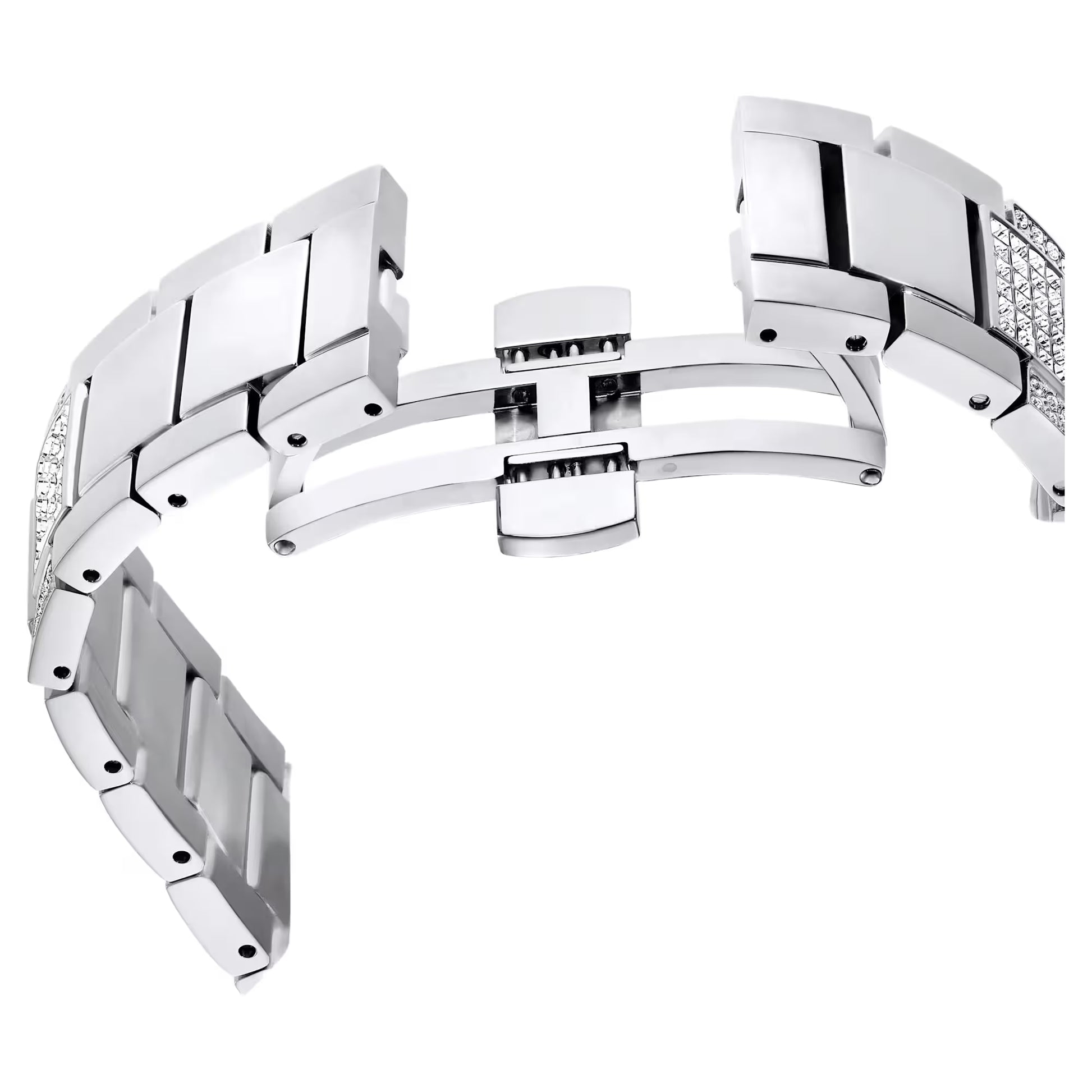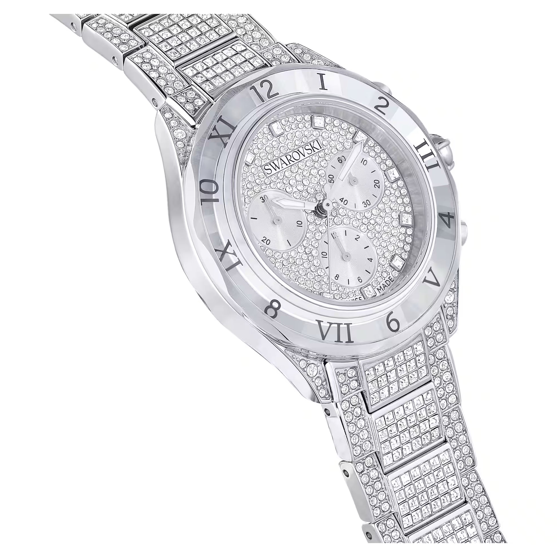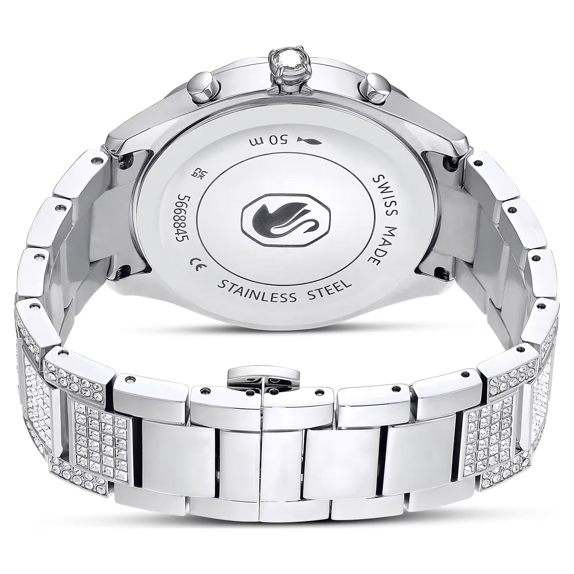 A truly dazzling ode to Swarovski savoir-faire, this iced-out Dextera timepiece radiates brilliance every hour. The 40mm stainless steel case is mounted with a crystallised bezel, cut to reflect the light. Most strikingly, the chronograph dial is embellished with 240 round-cut crystals and three subdials including a minutes counter, seconds counter and hours counter. For maximum shine, the index markers are indicated with individual crystals and the hands are coated in bright Luminova. The case itself is encrusted with 40 crystals, with a single crystal set in the crown, and a total of 492 crystals adorn the stainless steel bracelet. This Swiss made watch is water resistant to 50 metres and exudes joyful extravagance.