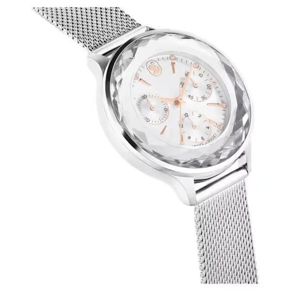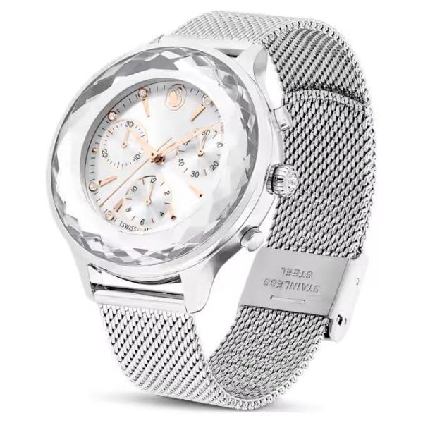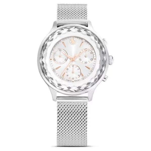 Epitomising sports luxe style, this Nova Chrono watch is meticulously crafted to highlight Swarovski’s mastery of design. The 37mm stainless steel case is seamlessly integrated with a beautifully faceted crystal bezel, as well as the watch’s sapphire glass. This frames the radiant sunray dial, which is adorned with a swan logo, crystal index markers and three subdials including a minutes counter, seconds counter and hours counter. Around the wrist, this modern timepiece is worn on a quick-release Milanese bracelet. The rose gold-tone hands are coated in Luminova for added brilliance. This Swiss made watch is water resistant to 50 meters, with a single crystal set in the crown, and is a versatile choice for both work and play.