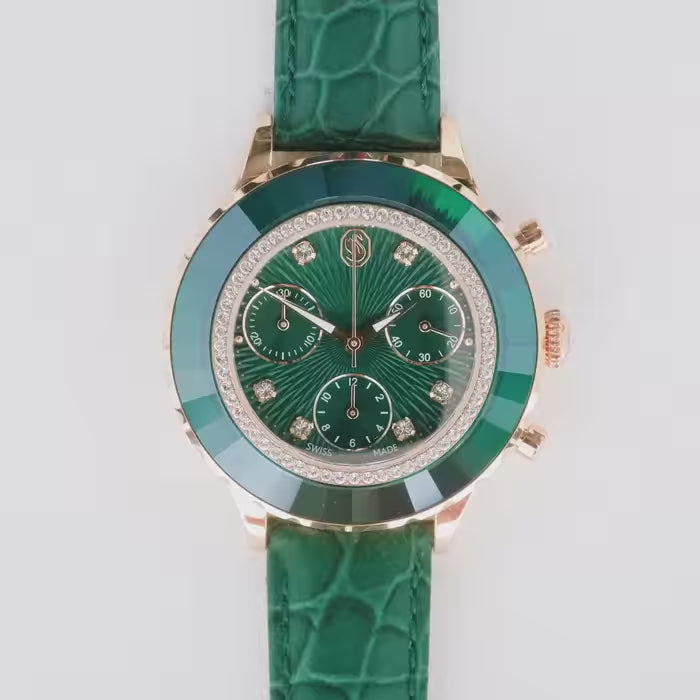 This ivory-coloured chronograph watch delivers a perfect fusion of watchmaking expertise and Swarovski savoir-faire. The round 37mm case is made with a rose gold-tone finish and features a signature crystallised bezel, which is neatly faceted and accompanied by a circle of clear pavé. Beneath the mineral glass, the guilloché dial features a swan logo at 12 o’clock, LumiNova coated hands and three chronograph counters for separate measurements of hours, minutes and seconds. There are also six clear crystals used for the indexes and a single crystal placed in the watch’s crown. This Swiss made watch is water resistant to 50m and is worn on a quick-release Italian calfskin leather strap in ivory with an embossed crocodile pattern.