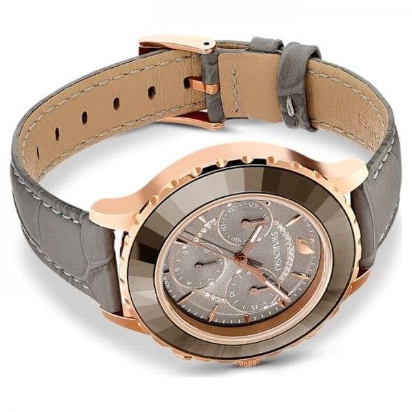 Blending classic Swiss watchmaking with Swarovski's crystal expertise, this luxurious new chronograph watch brings together precision, luxury and craftsmanship. Perfect for everyday wear, it features a stopwatch function with accumulated and interval timing. The rose gold-tone coated stainless steel case harmonises beautifully with the faceted grey crystal bezel exclusive to Swarovski watches, the warm grey sunray dial and the grey crocodile-embossed genuine leather strap. Case: 39 mm, water resistant to 50 m, Swiss Made.
