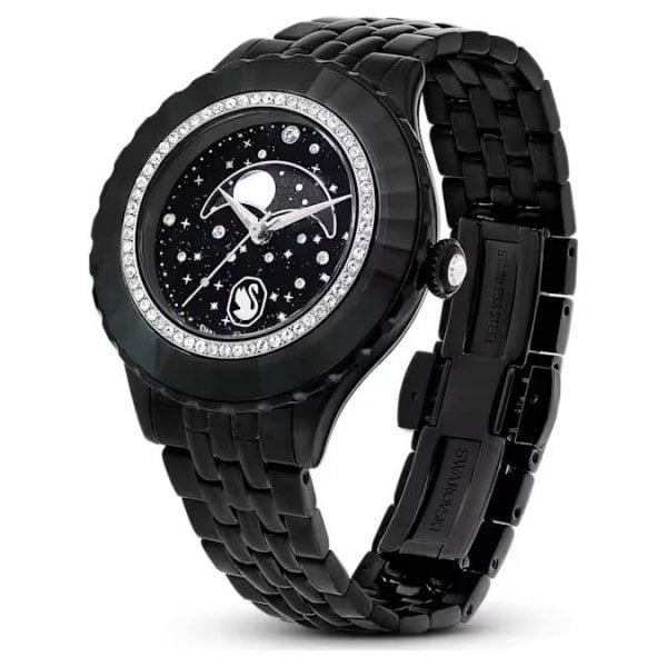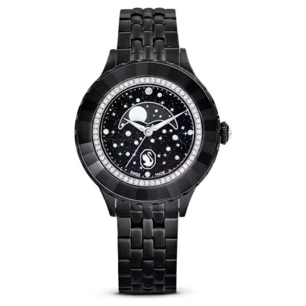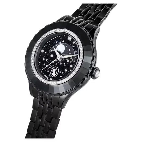 In tribute to the 55th anniversary of the first moon landing, this Octea Moon watch exquisitely links the passage of time with the lunar cycle. The 37mm metallic case features a black finish and is mounted with a faceted bezel in black crystal, along with an inner ring of shimmering pavé. This frames the black dial, which is majestically decorated with 11 round-cut crystals to represent a star-filled cosmos. Four more crystals serve as quarter-hour index markers. The captivating moon phase function sits just above the Luminova hands, while an elegant swan logo is positioned at 6 o’clock. Around the wrist, this watch is worn on a multilinked bracelet with a black finish. This Swiss made timepiece is water resistant to 50 meters and is a spectacular statement piece with intergalactic appeal.