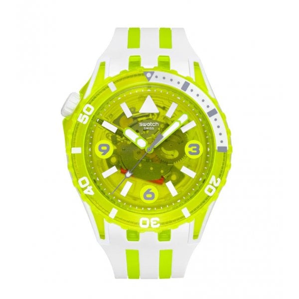 The transparent yellow dial of this diving watch features white printed indexes, gray printed numerals, yellow hour and minute hands, and a gray seconds hand, all with glow-in-the-dark effect, under biosourced glass. The case combines matte white Bioceramic and shiny transparent yellow biosourced material and is paired with a shiny transparent yellow biosourced bezel with gray and white print that glows in the dark and a matte white Bioceramic crown at 10 o'clock. A matte white and matte transparent yellow strap with a matte white loop and shiny, transparent yellow biosourced buckle complete the watch.