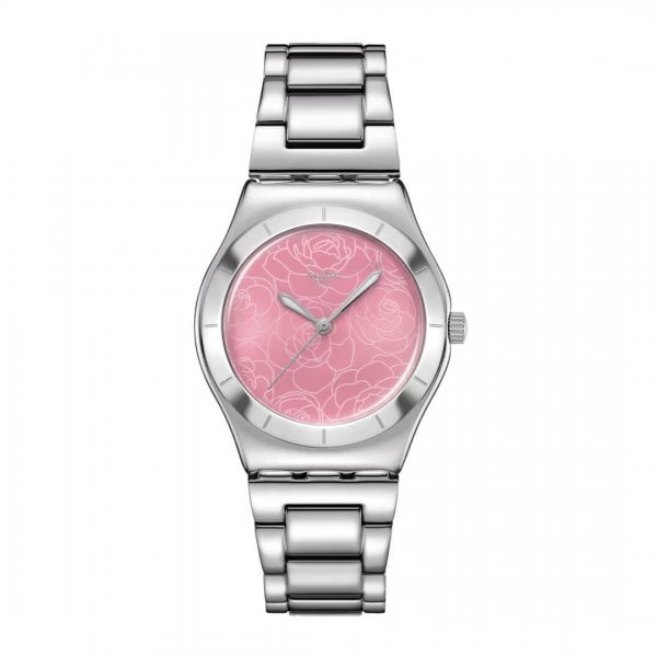 This sleek, stainless steel timepiece features a pink sun-brushed dial with a printed white floral pattern, silver-colored hour and minute hands with glow-in-the-dark effect and a silver-colored seconds hand. The watch has a polished stainless steel case and matching bezel with engraved hour markers. A polished stainless steel bracelet with butterfly buckle finishes the look.
