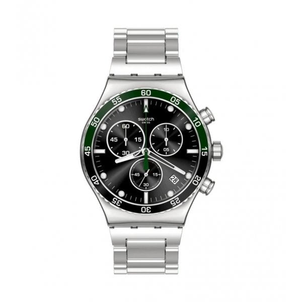 This stylish stainless-steel chronograph watch features a polished case with a sun-brushed black dial that elevates the elegant green in the bezel and the matching seconds hand. The polished bracelet is adjustable and includes a butterfly buckle.