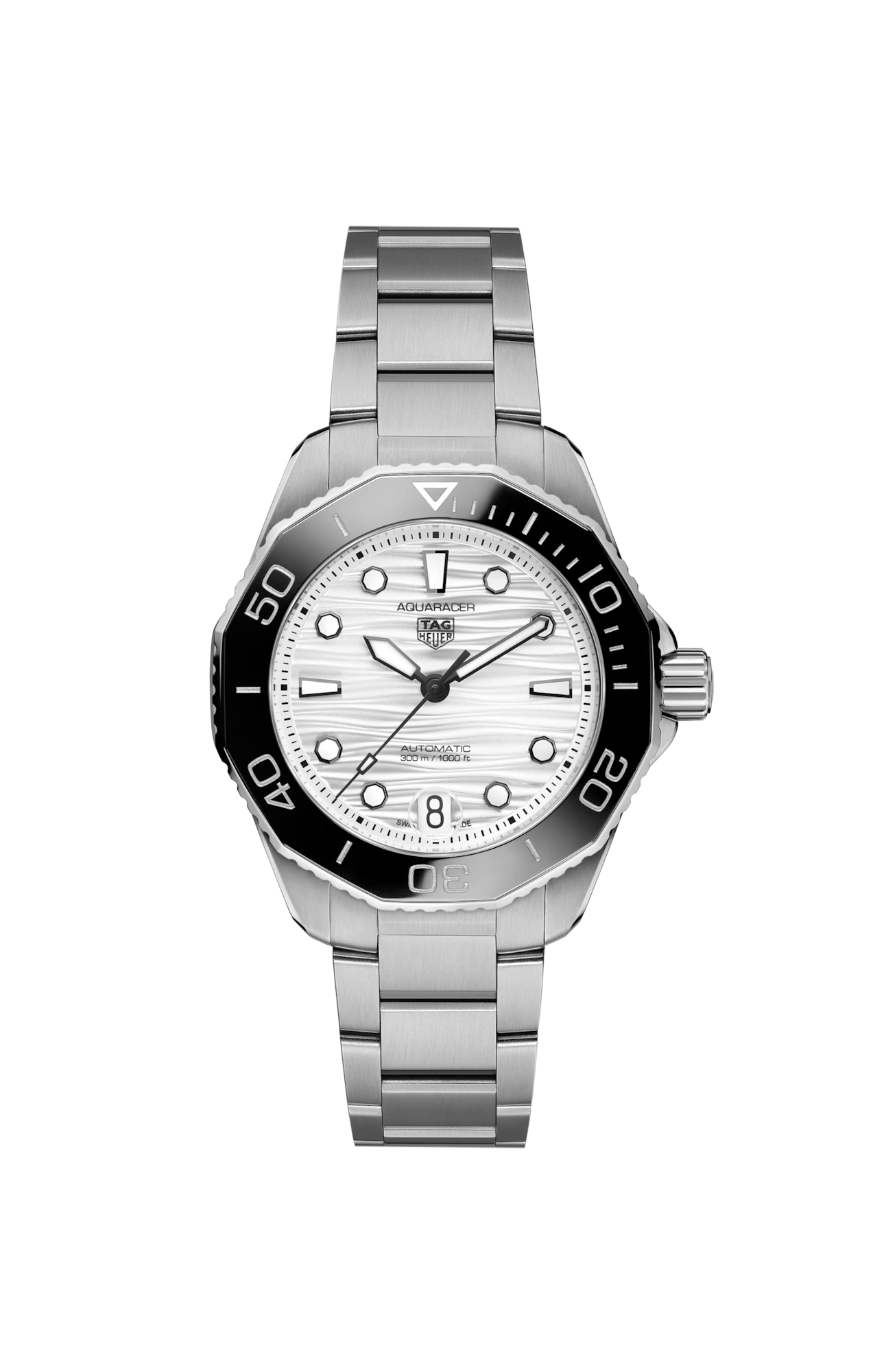 Meet the perfect diving companion in 36mm. This special edition TAG Heuer Aquaracer, with its silver-lacquered dial, is ready for any challenge. Bold black gold-plated hands and markers applied with white Super-LumiNova® offer absolute legibility day and night.