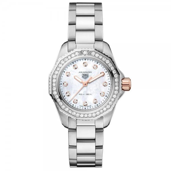 Shimmering gems and bright white mother-of-pearl adorn this prestigious 30mm TAG Heuer Aquaracer. The delicately crafted, enduring design in steel is ready to take on any challenge with absolute sophistication.