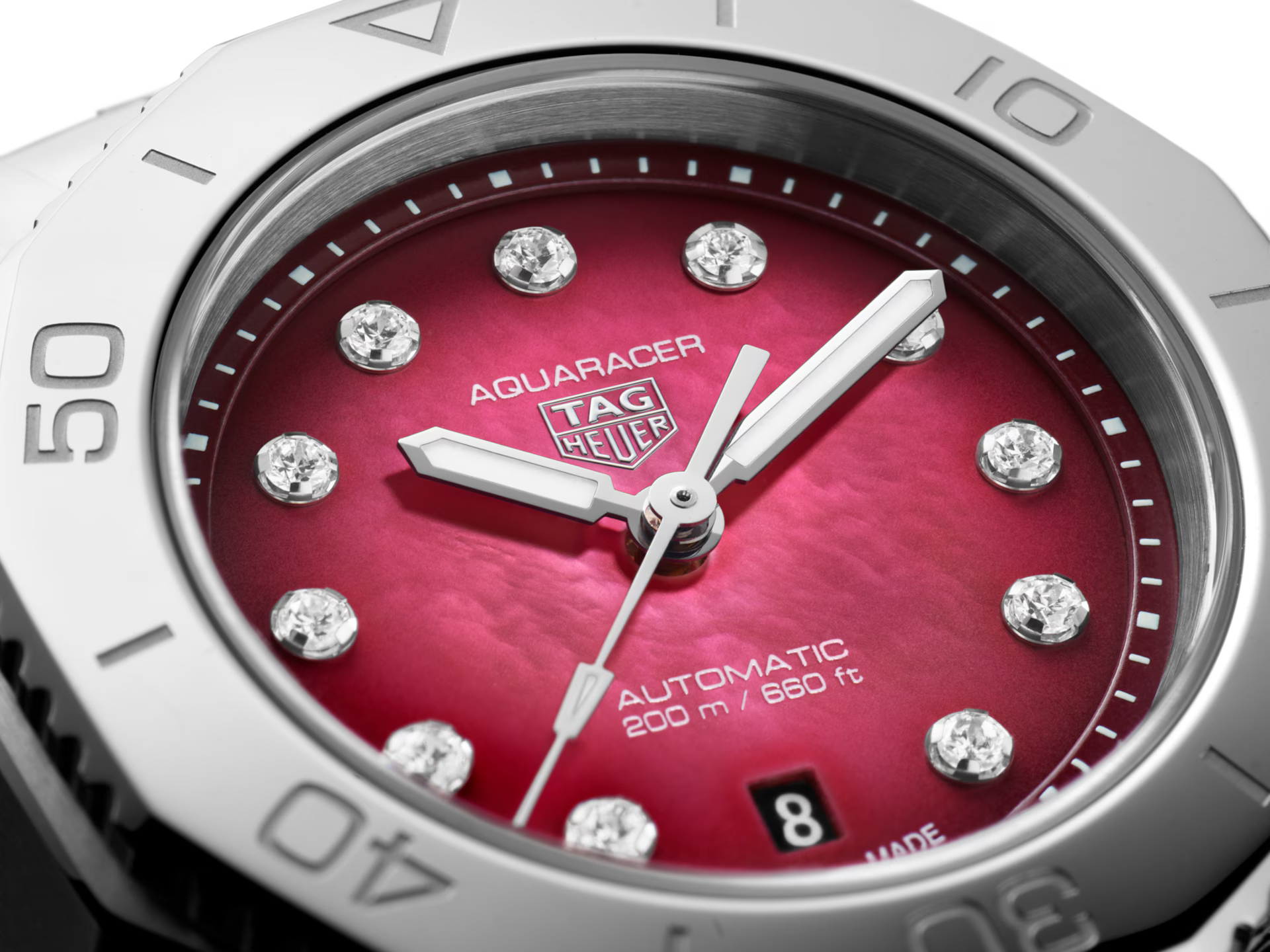 Embrace the warm colours of autumn with this 30 mm TAG Heuer Aquaracer and its intense ruby-red mother-of-pearl dial, elegantly set with eleven VS 1.4mm-diametre diamonds (0.107 ct). Crafted in unbreakable steel, this luxurious timepiece can withstand any feat.
