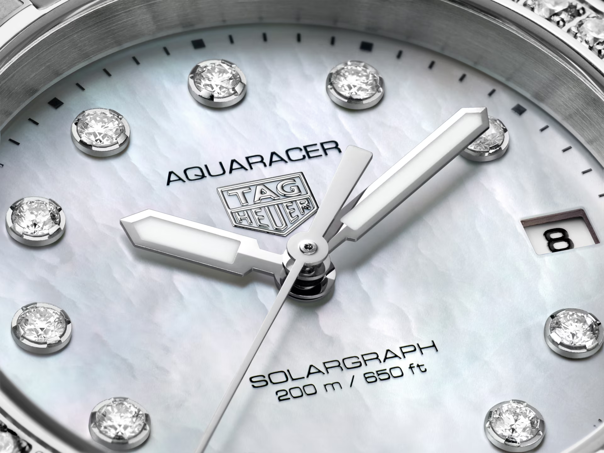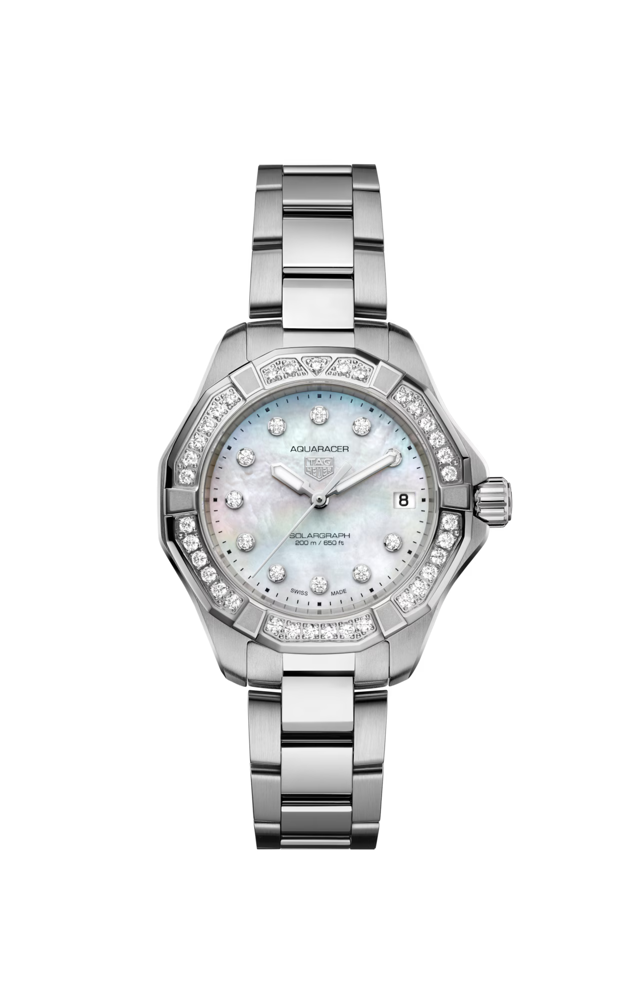 Thirty-five glistening diamonds (0.6cts) set on the bezel and eleven diamonds (0.15cts) on the radiant mother-of-pearl dial elevate this 34mm TAG Heuer Aquaracer. Meticulously crafted in steel, it combines enduring resilience with unparalleled sophistication, ready to face any challenge with sheer elegance.