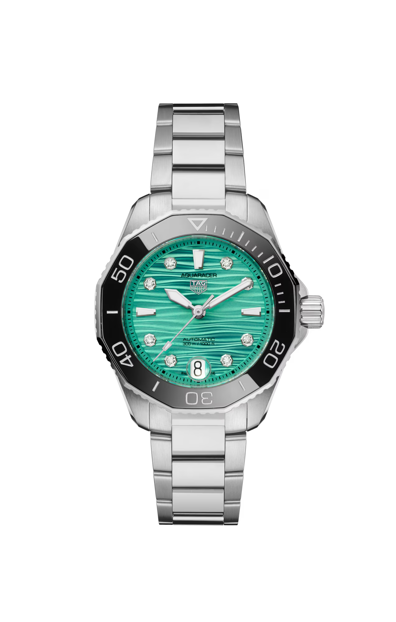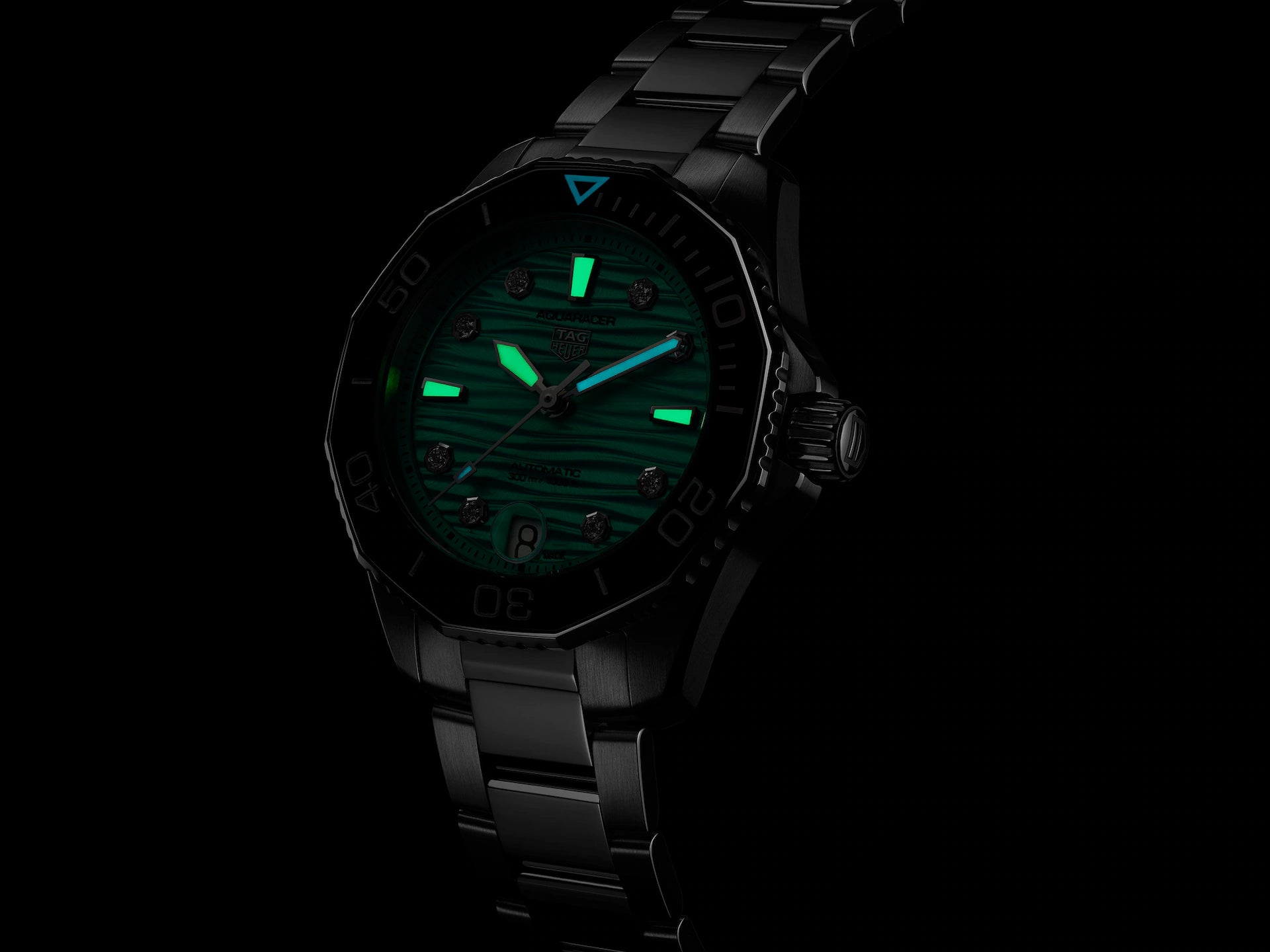 Reminiscent of idyllic lagoons, the bold turquoise colour of the dial sets the scene for this 300-metre water resistant TAG Heuer Aquaracer Professional. Designed to withstand extreme pressure, this diver is ready to push boundaries.